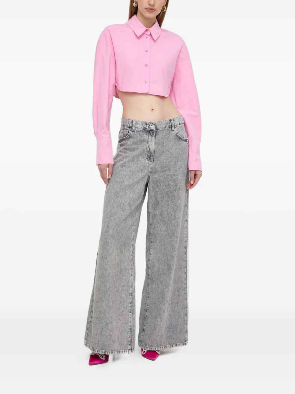 розовая булавка в виде насекомого, застёжка на пуговицы, длинные рукава, укороченный крой, отложной воротник