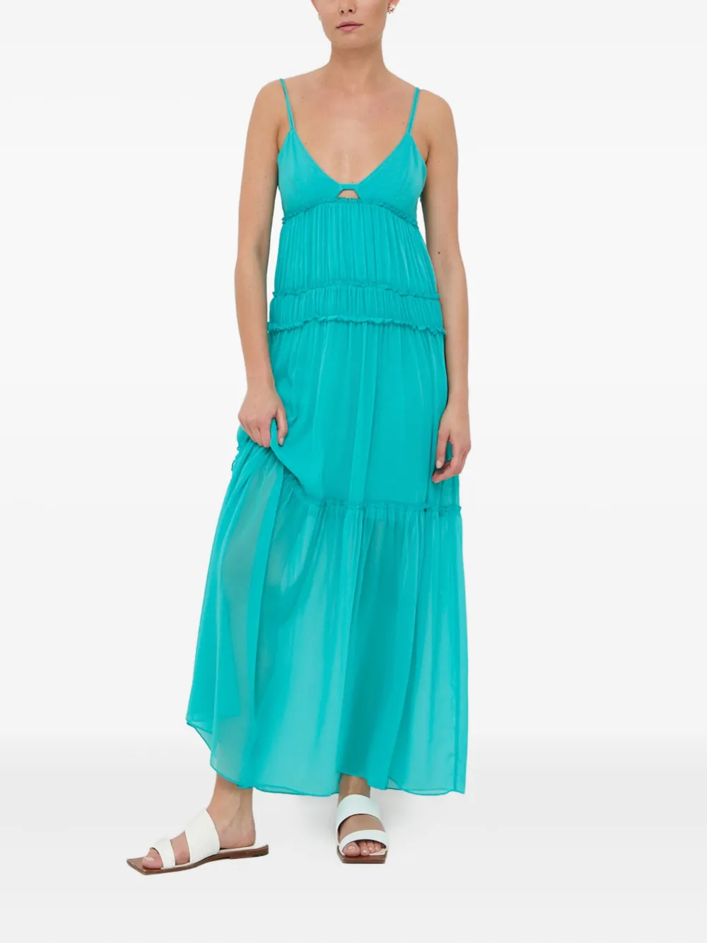 бирюзовый многослойный дизайн, оборки, тонкие бретели, вырез
