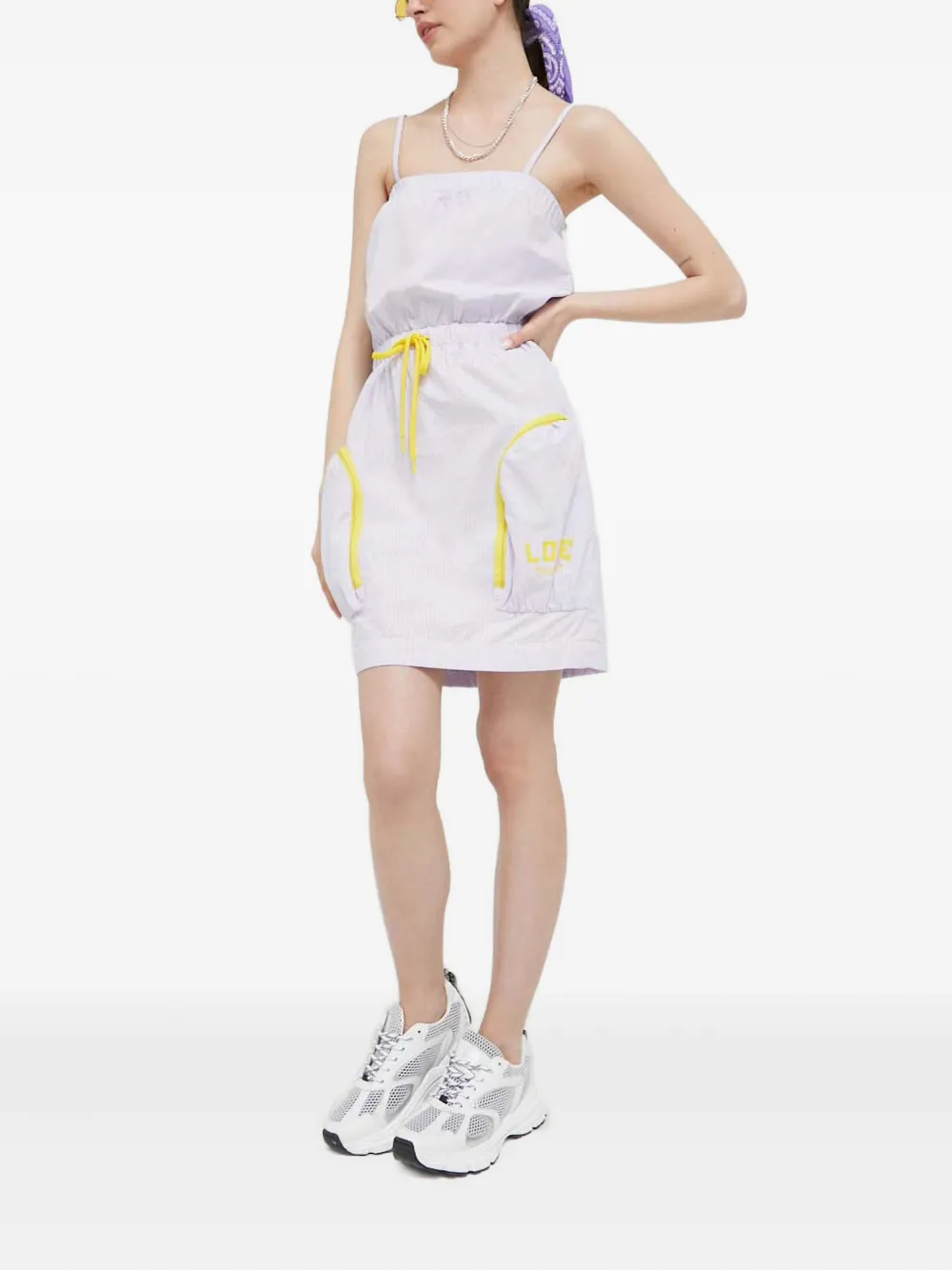 фиолетовый с полосками, застежка на кулиску, два кармана, детали с молнией, тонкие бретели