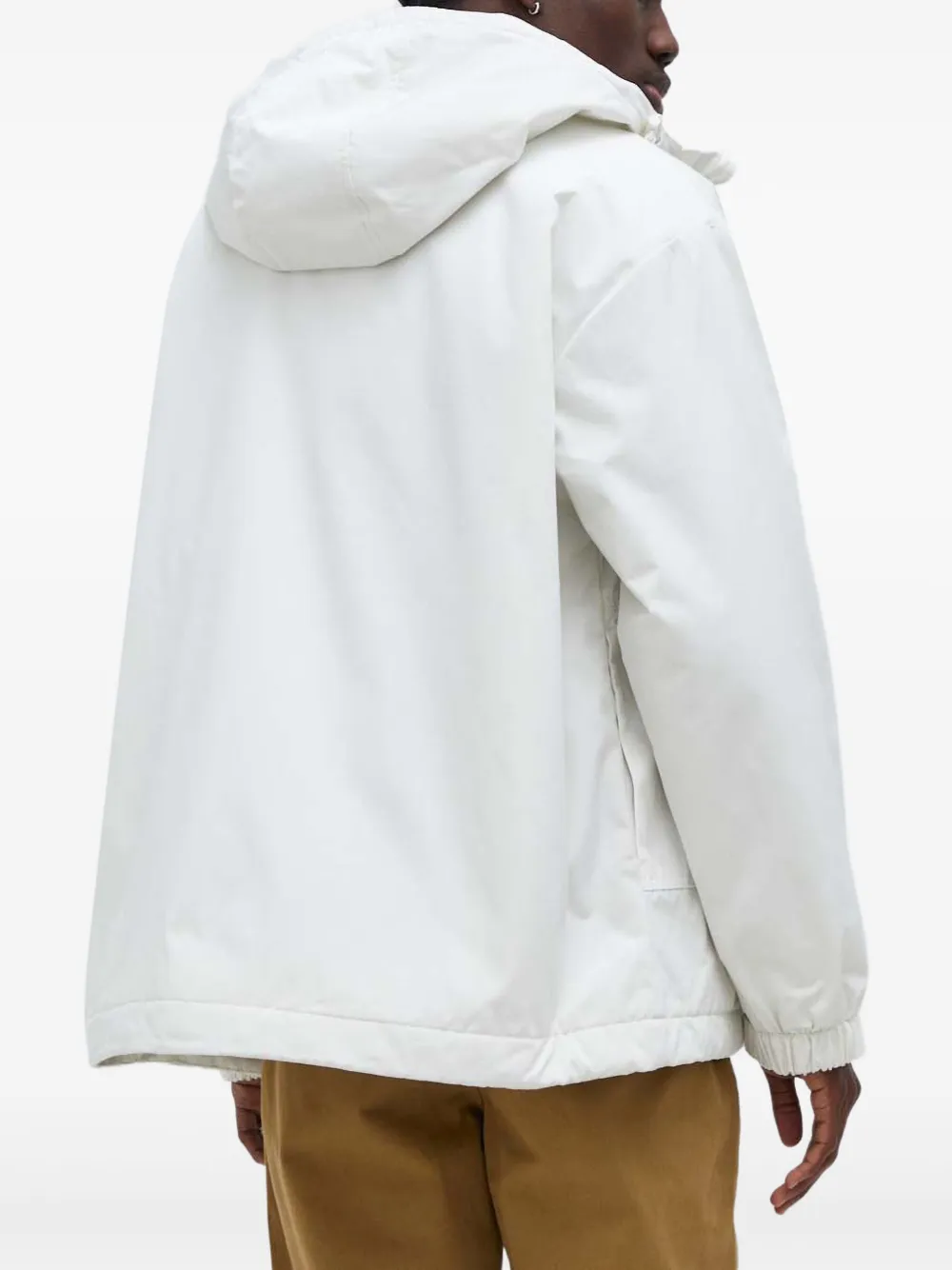 белый цвет, нагрудные накладные карманы, застежка-молния спереди, длинные рукава, капюшон