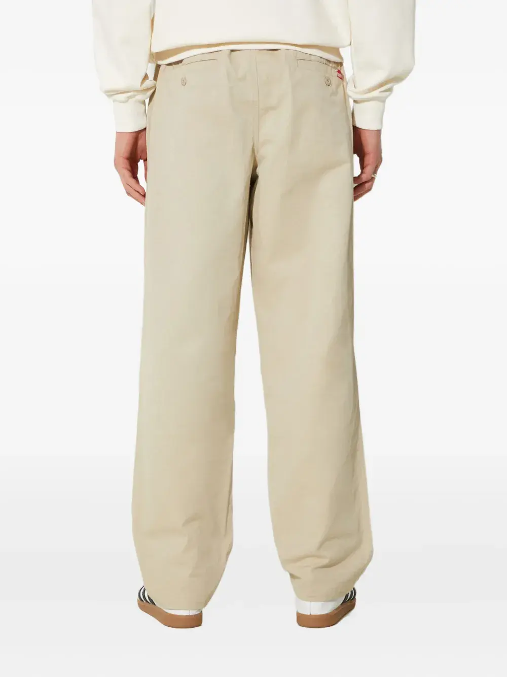 бежевые брюки с задними карманами на пуговицах, логотипом и боковыми карманами