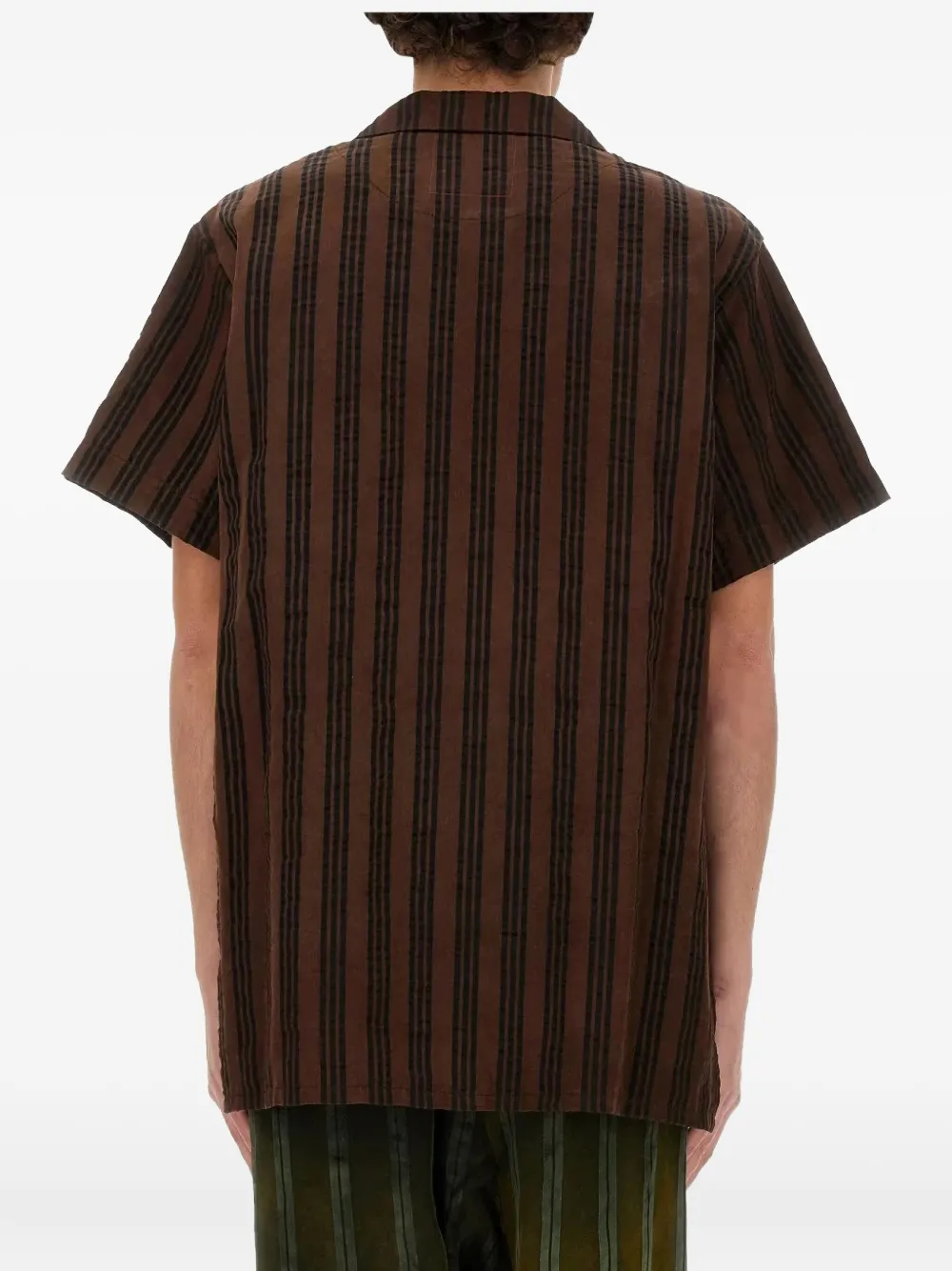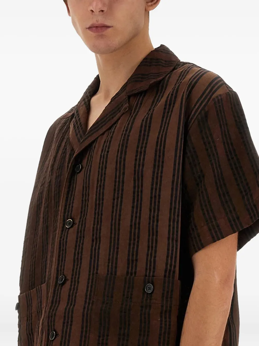 коричневая рубашка в полоску с застежкой на пуговицы, короткими рукавами, накладными карманами спереди и воротником