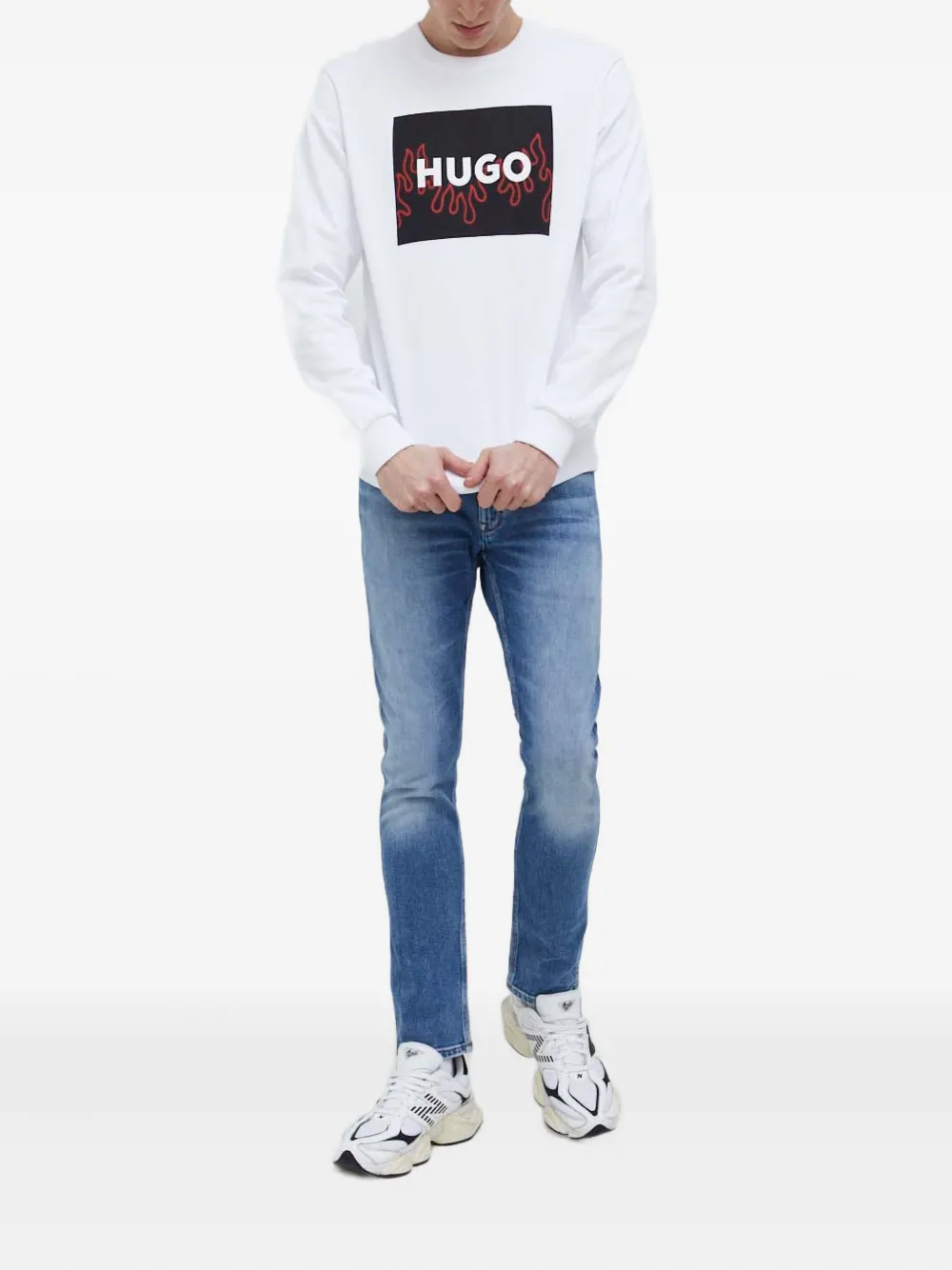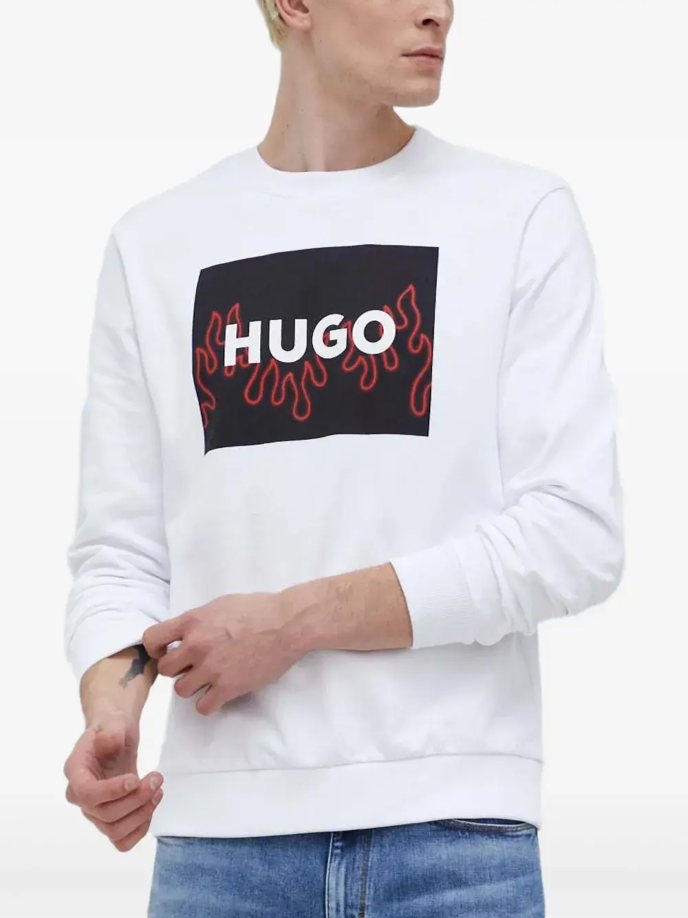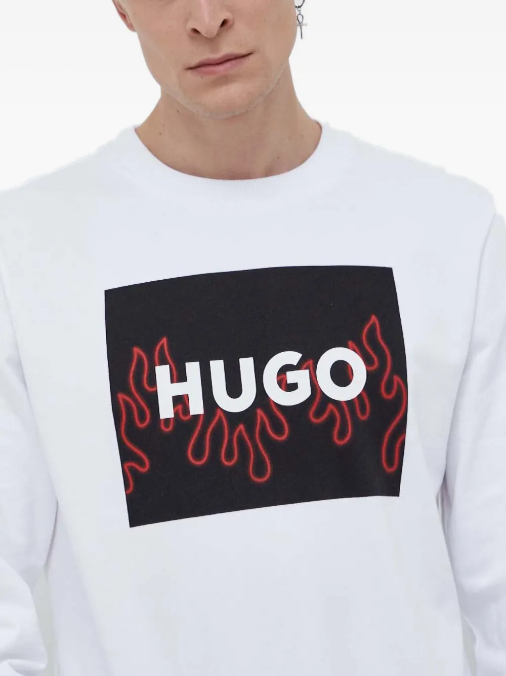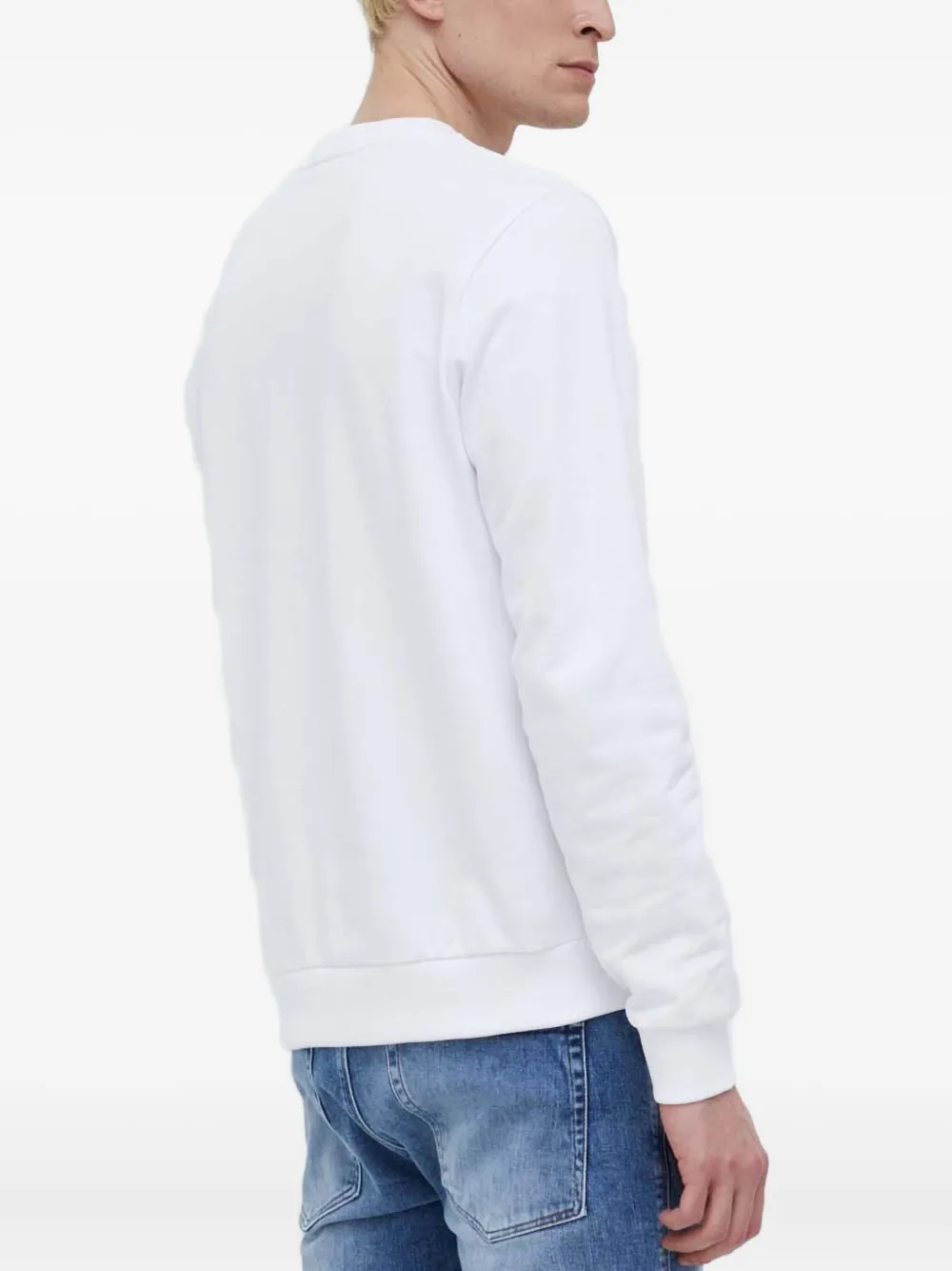 белый свитшот с графическим принтом, круглым вырезом, длинными рукавами, ребристыми манжетами и поясом