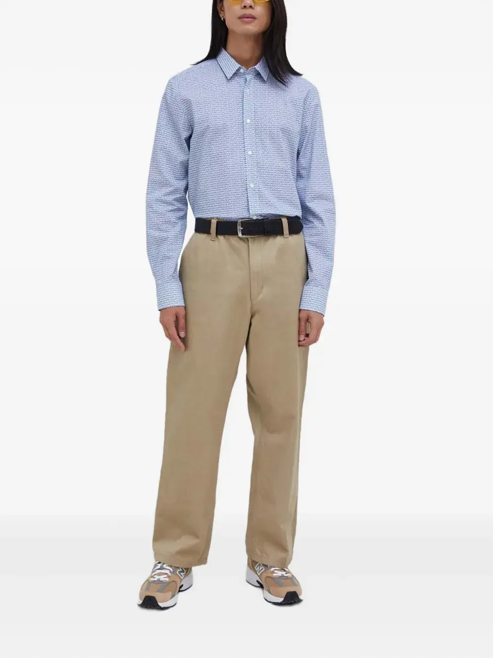 синий цвет, принт с логотипом по всей поверхности, застежка на пуговицы, длинные рукава, манжеты на пуговицах