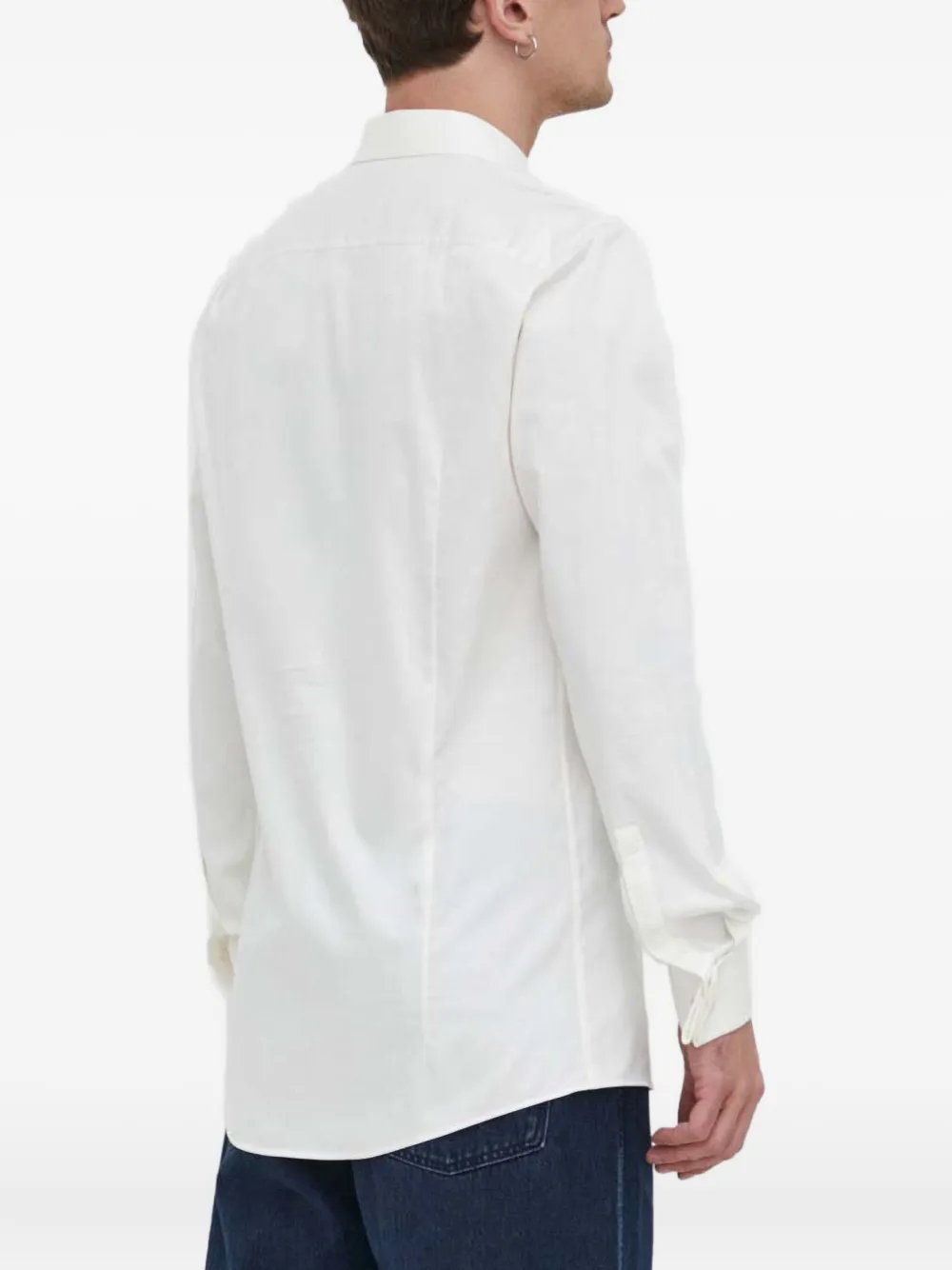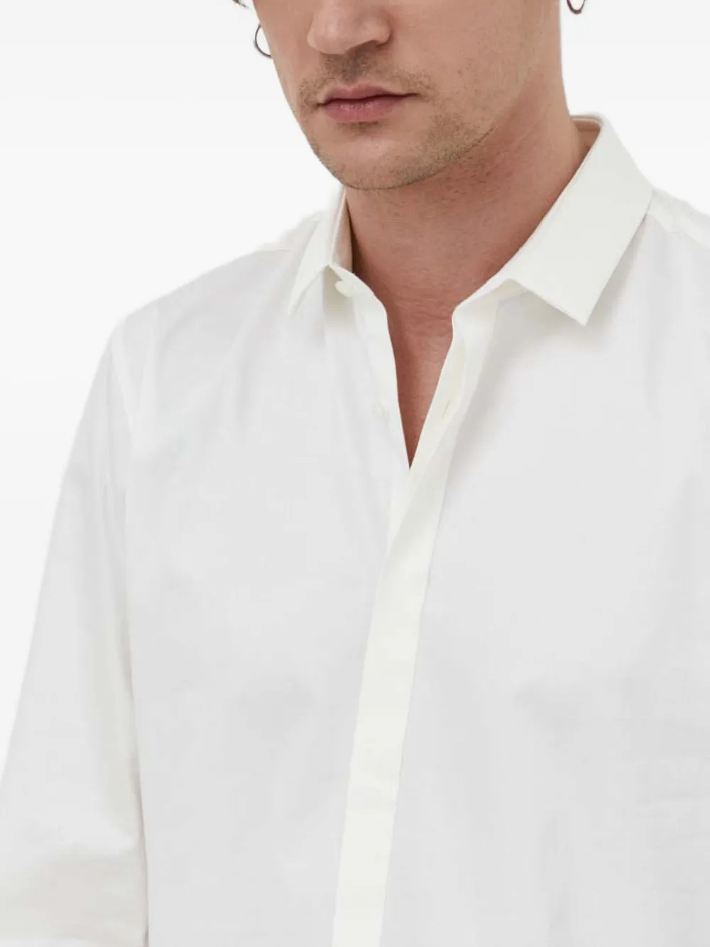белая рубашка с застежкой на пуговицы, длинными рукавами и манжетами на пуговицах