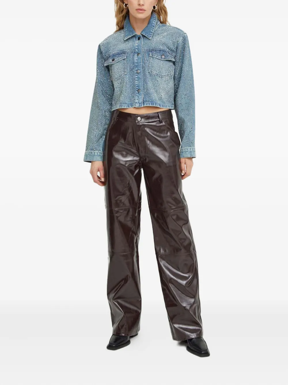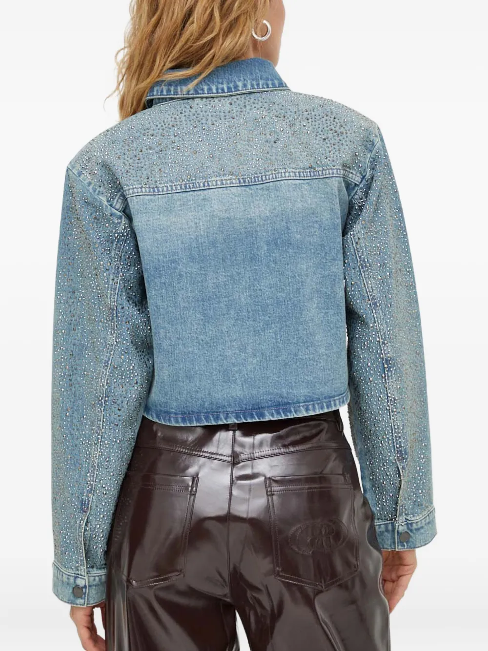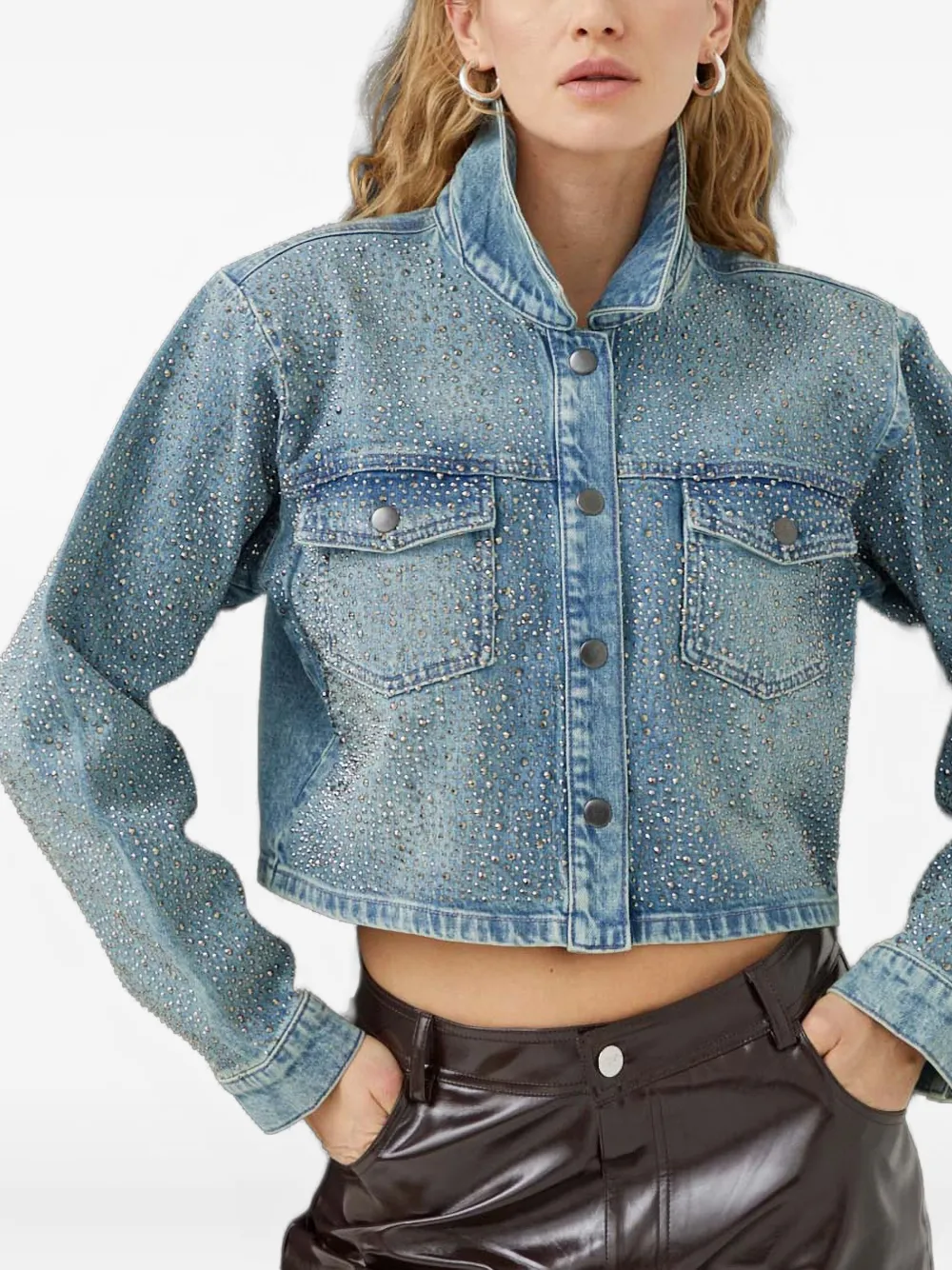 светло-голубой, украшения в виде заклепок, классический воротник, застежка на пуговицы, нагрудные карманы, длинные рукава