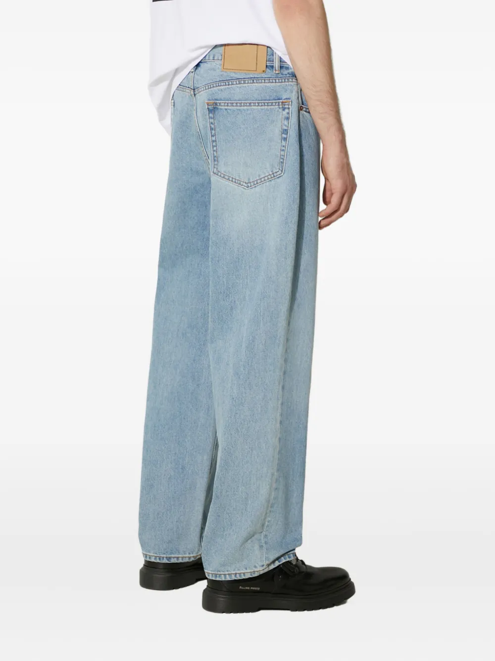 выцветший синий, кожаная нашивка на поясе сзади, шлевки для ремня, задние карманы, отделочная строчка
