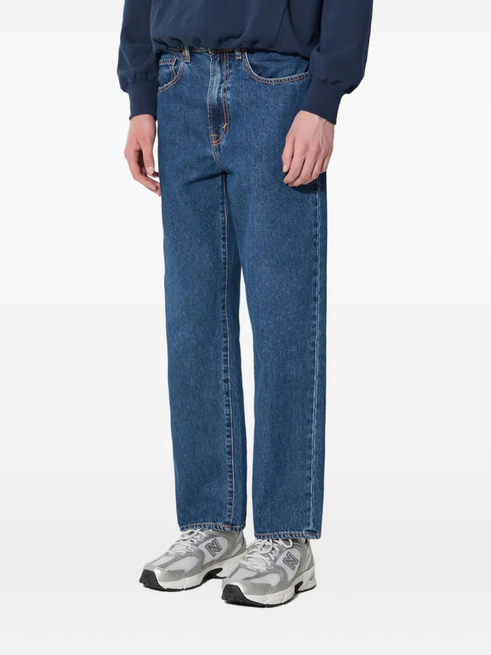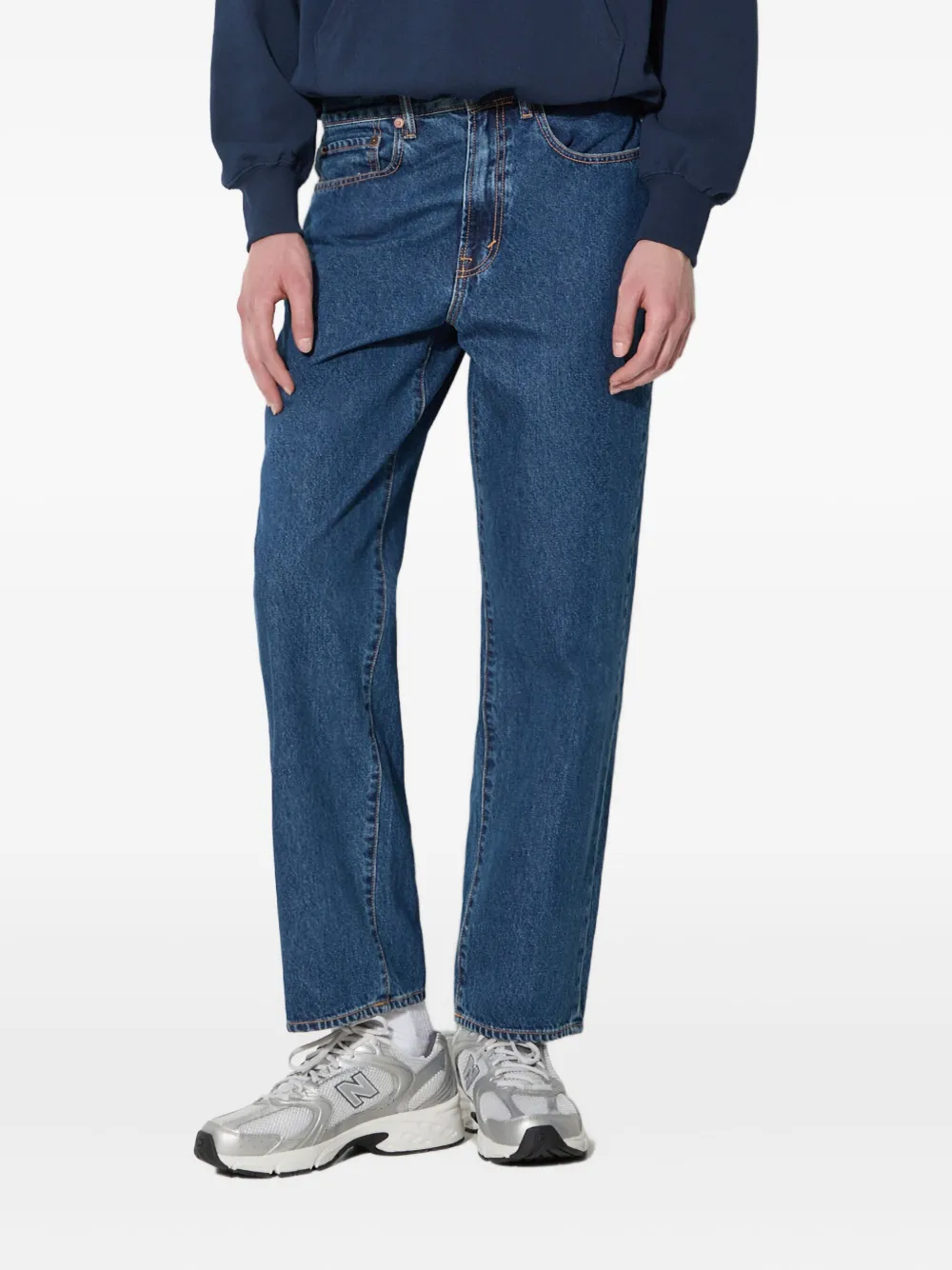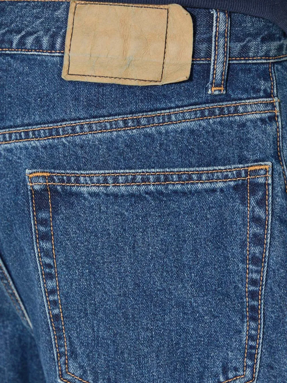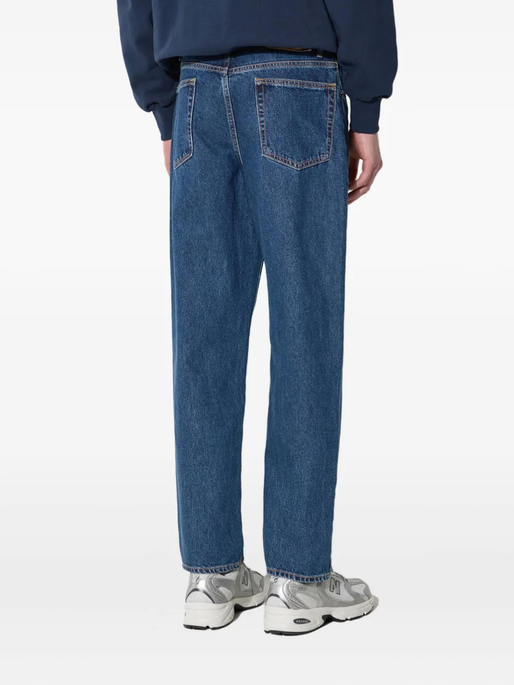 синие джинсы с пятью карманами, шлевками для ремня, нашивкой сзади с логотипом и декоративной отстрочкой