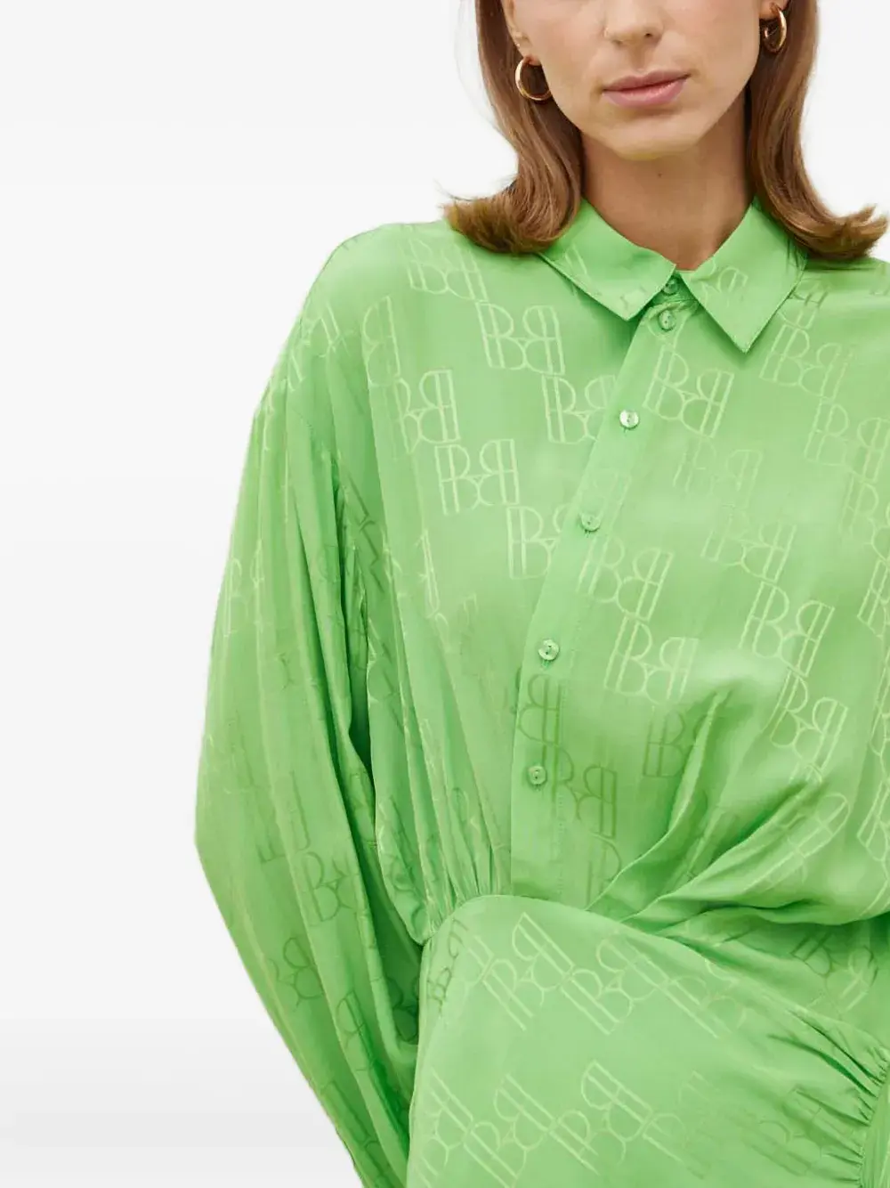 зелёный цвет, узор по всей поверхности, застёжка на пуговицы, длинные рукава, воротник, сборки (драпировка)