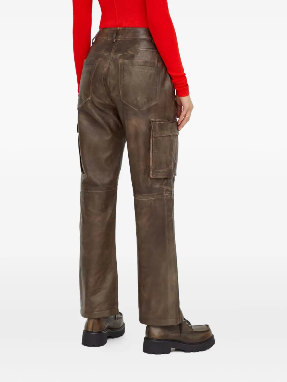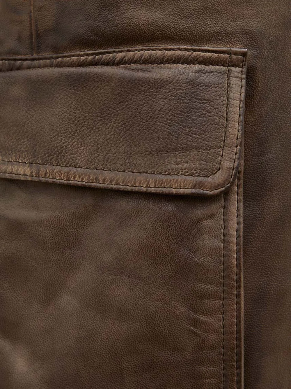 коричневая кожа, накладные карманы карго, комбинированный дизайн, шлевки для ремня, отделочная строчка, задние накладные карманы
