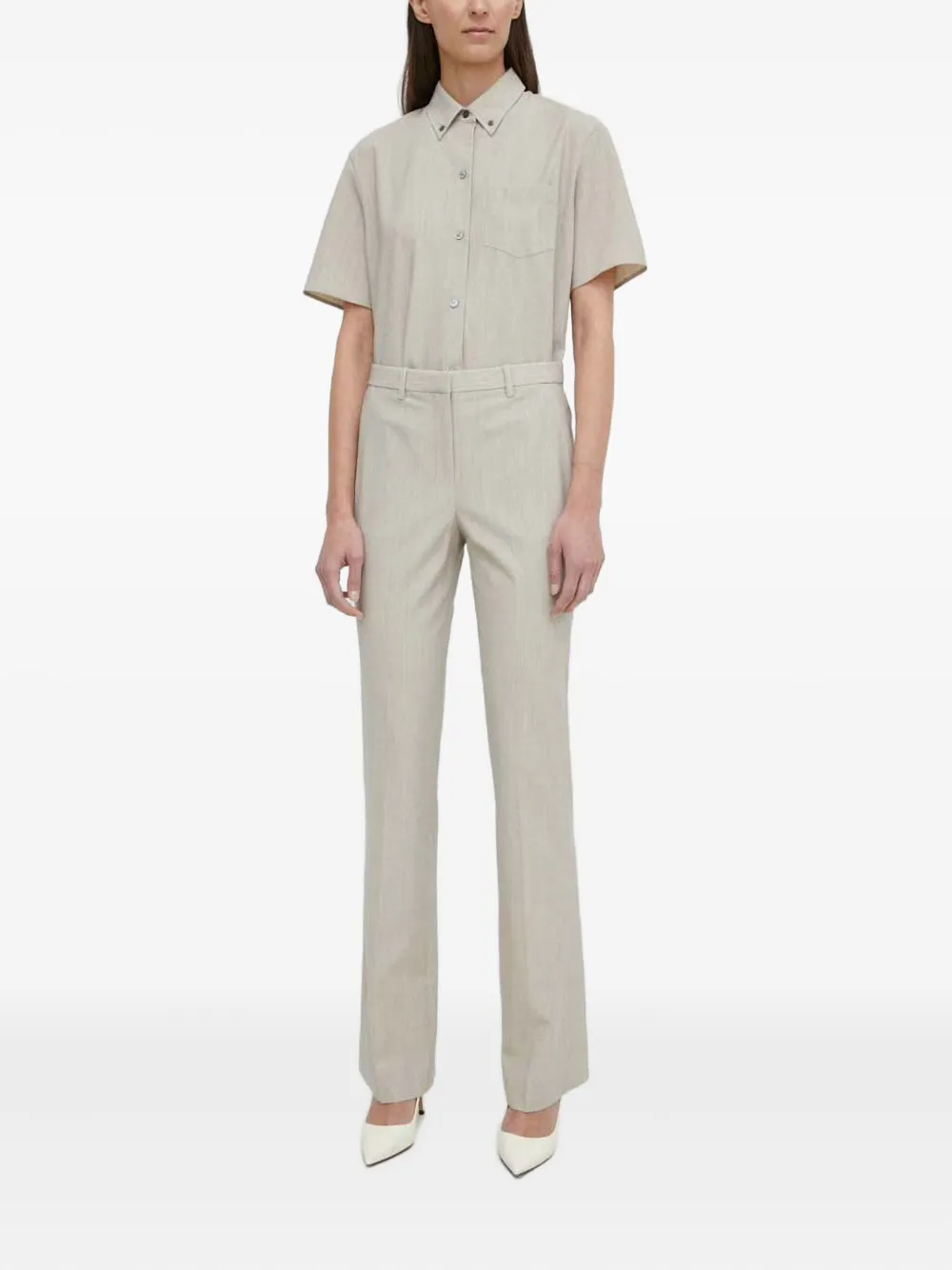 серые, шлевки для ремня, боковые карманы в шве, задние прорезные карманы