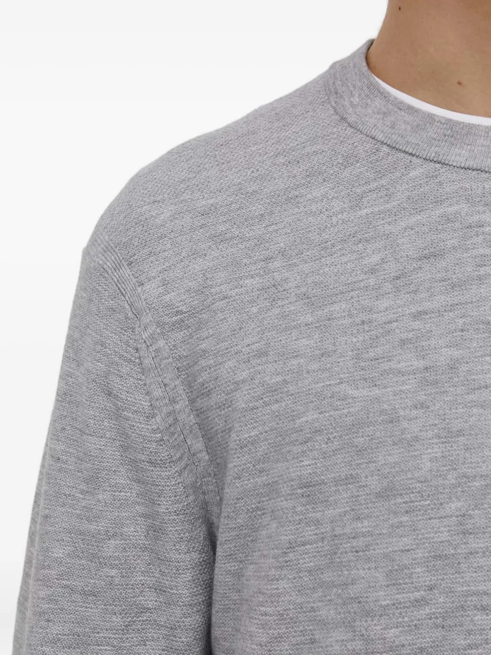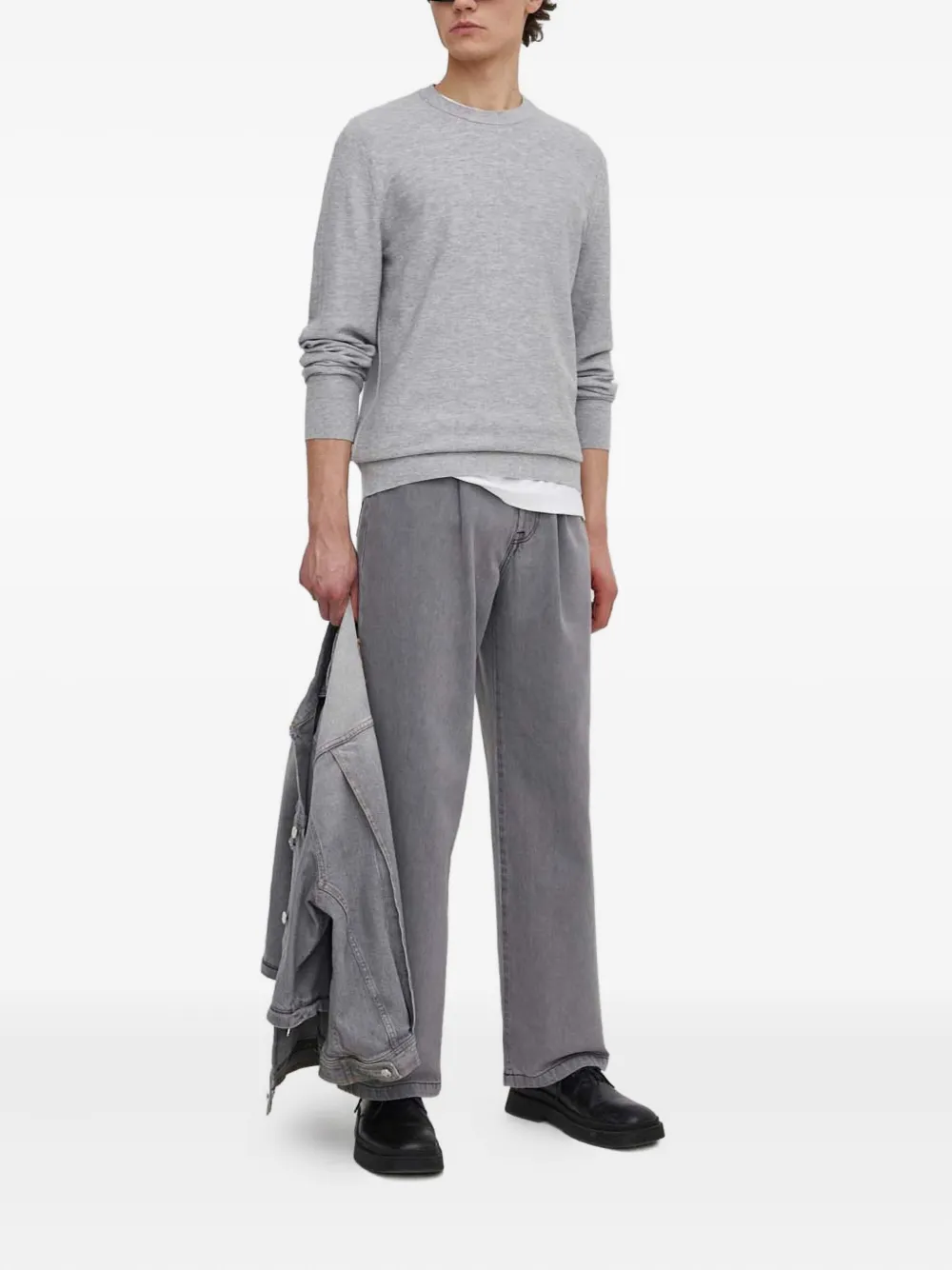 светло-серый свитер с круглым вырезом, длинными рукавами и однотонной строчкой