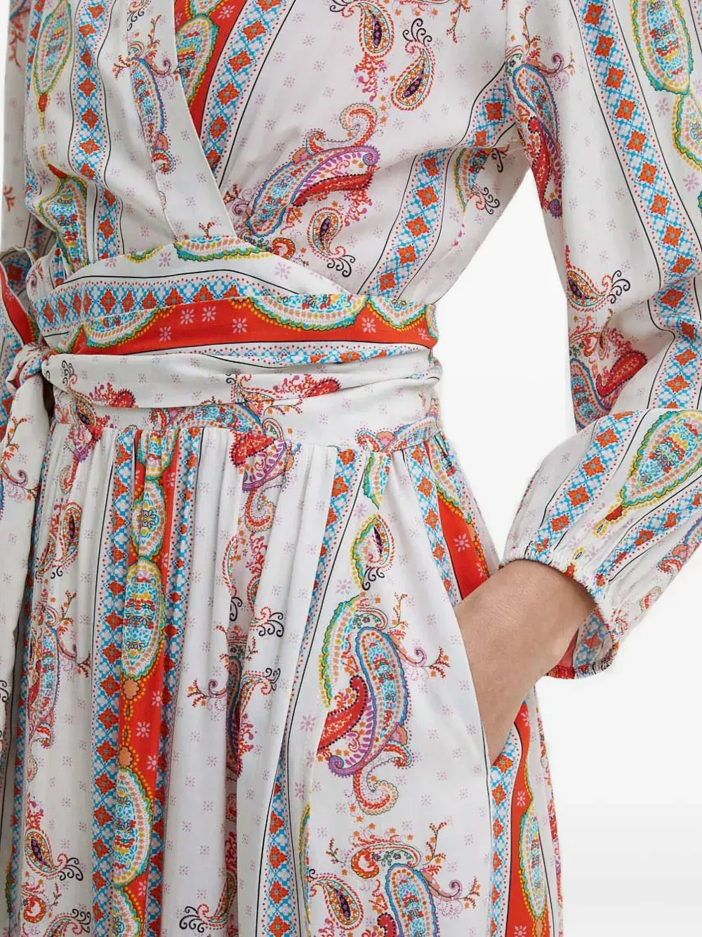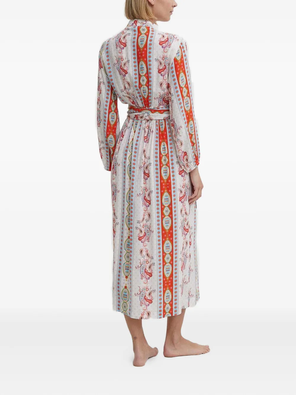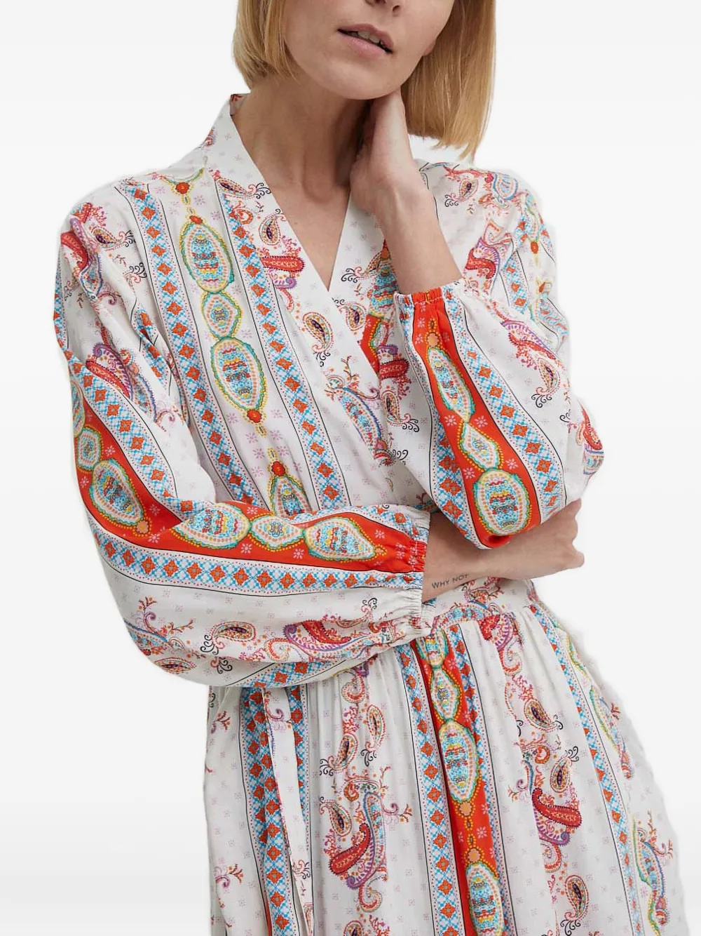 белый с принтом по всей поверхности, запах, длинные рукава, пояс, V-образный вырез