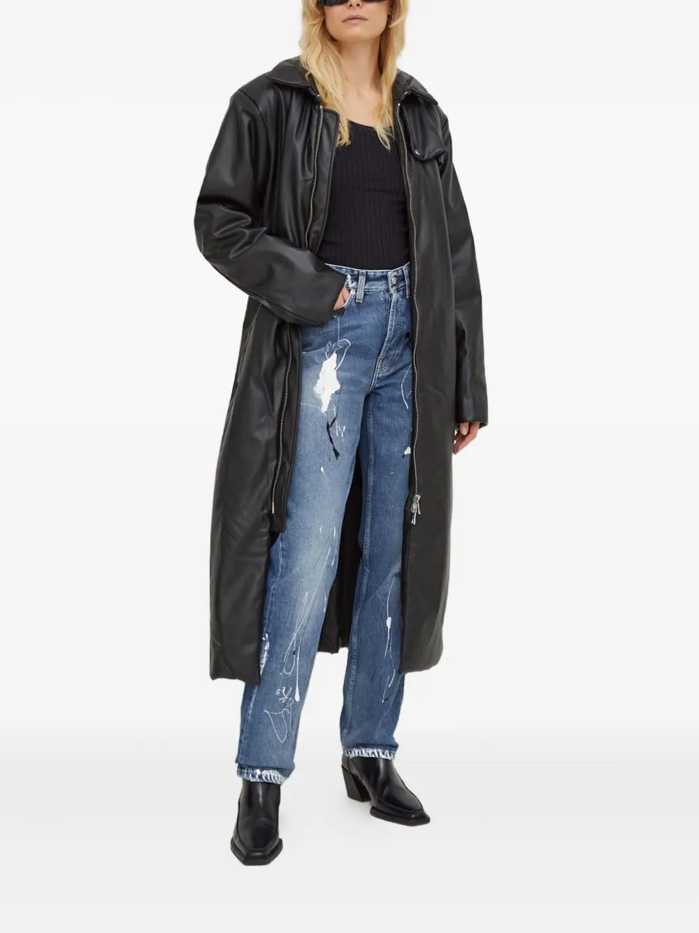 синие детали с эффектом краски, пять карманов, шлёвки для ремня, застёжка на пуговицу, нашивка с логотипом сзади