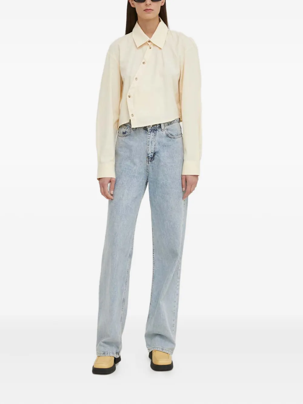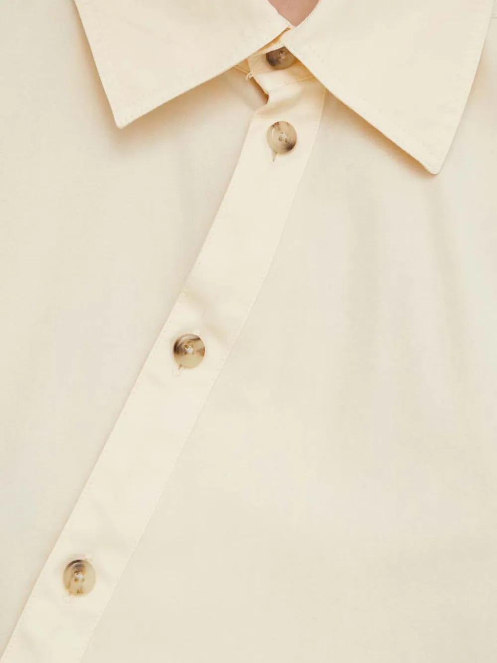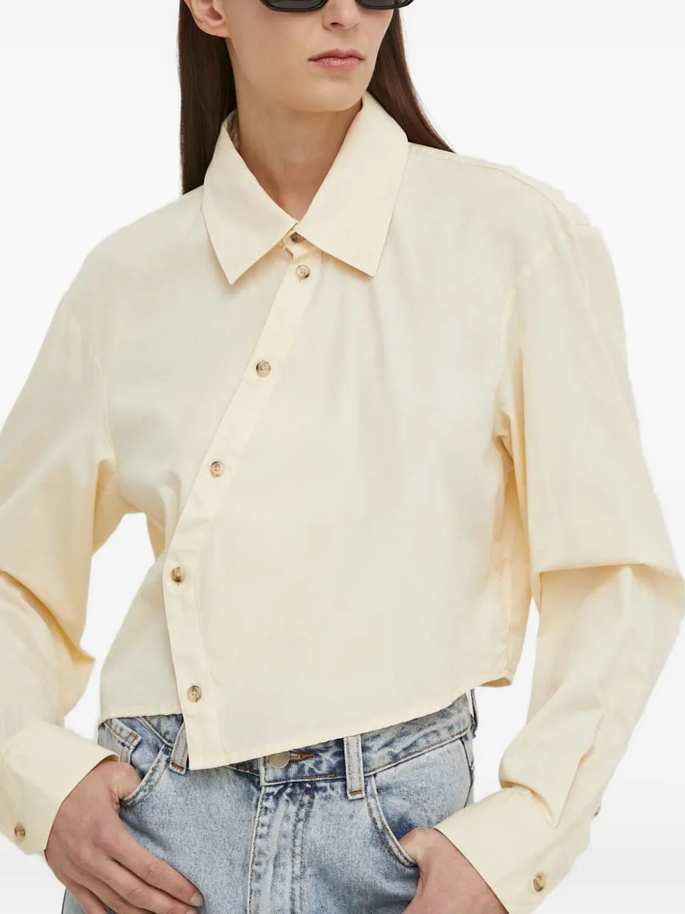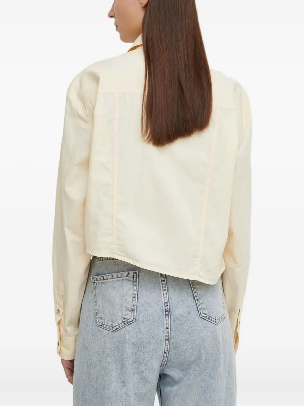 светло-бежевый цвет, застежка на пуговицы, длинные рукава, классический воротник, укороченный стиль, кокетка на спинке