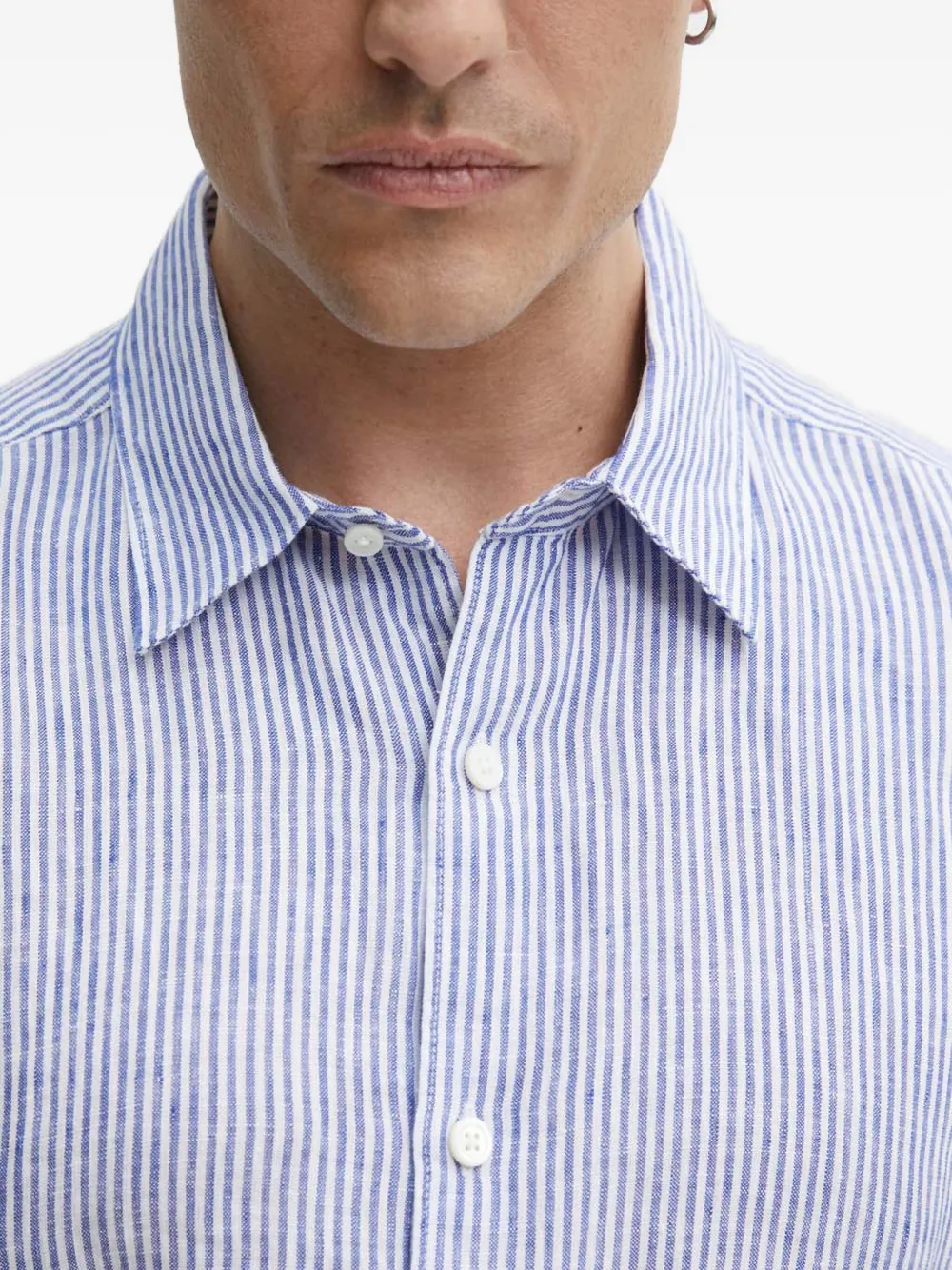 голубая рубашка в полоску с короткими рукавами, застёжкой на пуговицы и воротником