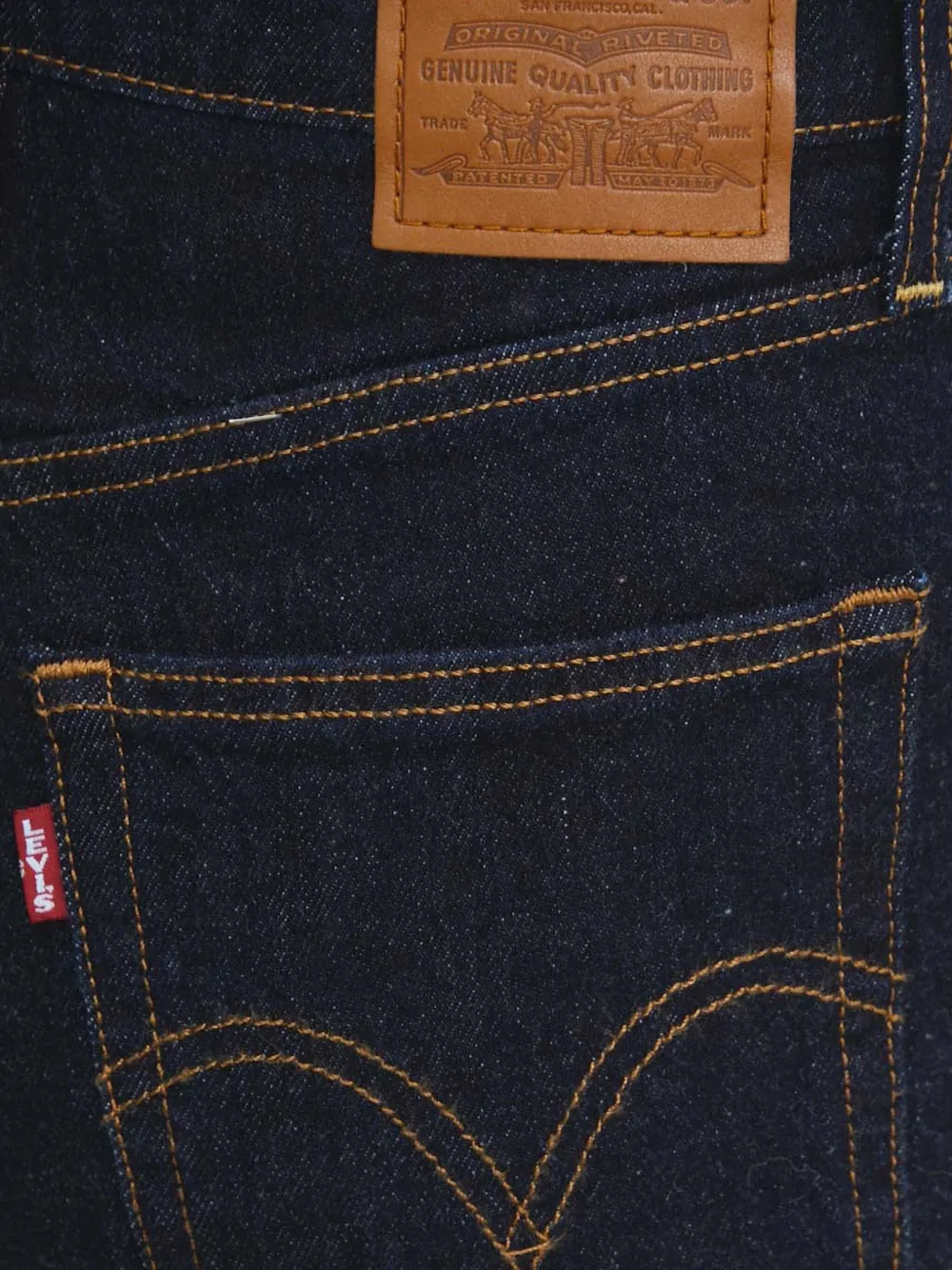 темно-синий цвет, контрастная строчка, классические пять карманов, нашивка с логотипом сзади, шлевки для ремня