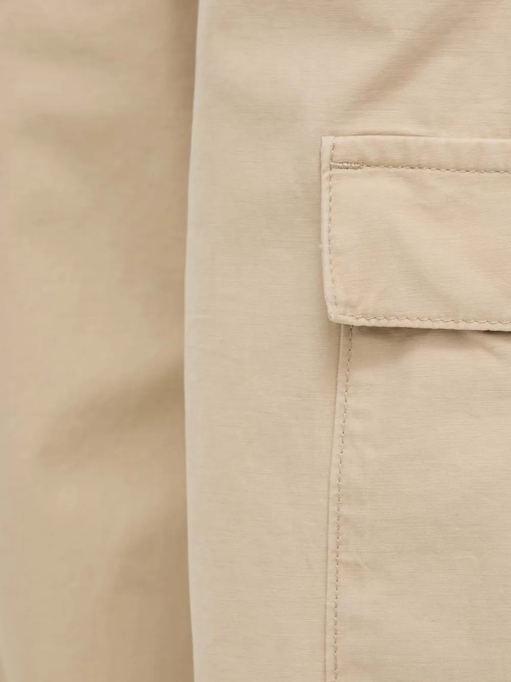 бежевые боковые накладные карманы, шлевки для пояса, застёжка на пуговицы, задние накладные карманы