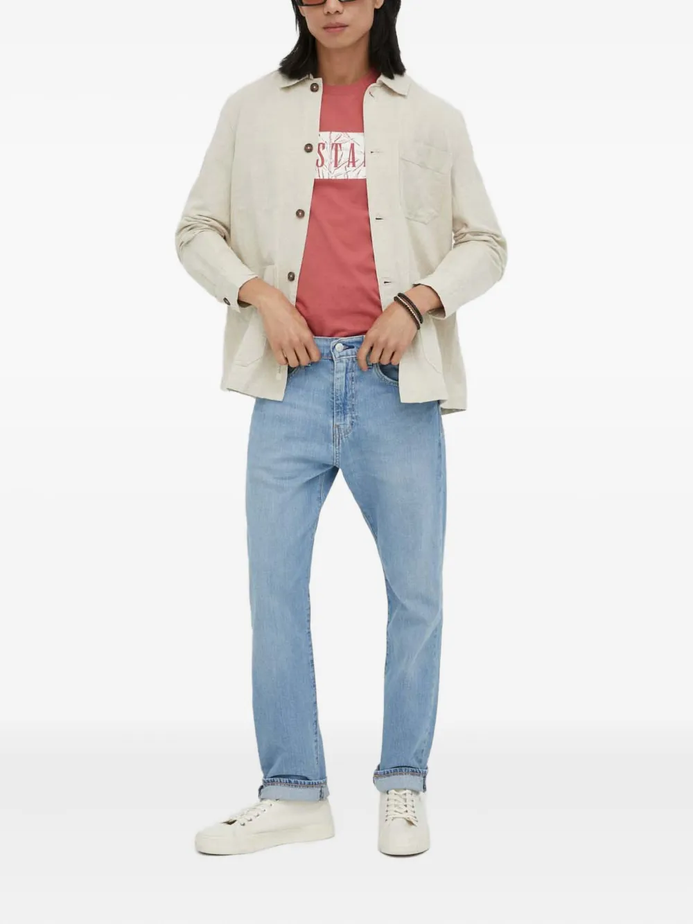 синие шлевки для ремня, пять карманов, отделочная строчка, нашивка с логотипом, застежка на пуговицу