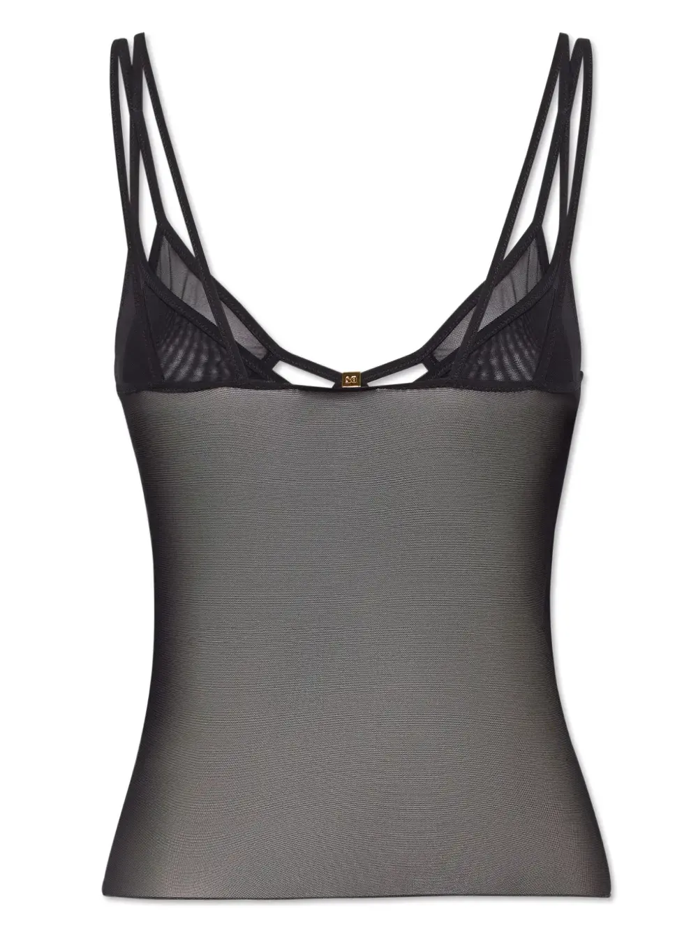 черный топ без рукавов с несколькими бретелями, декорированный золотым металлическим элементом с дизайном D2