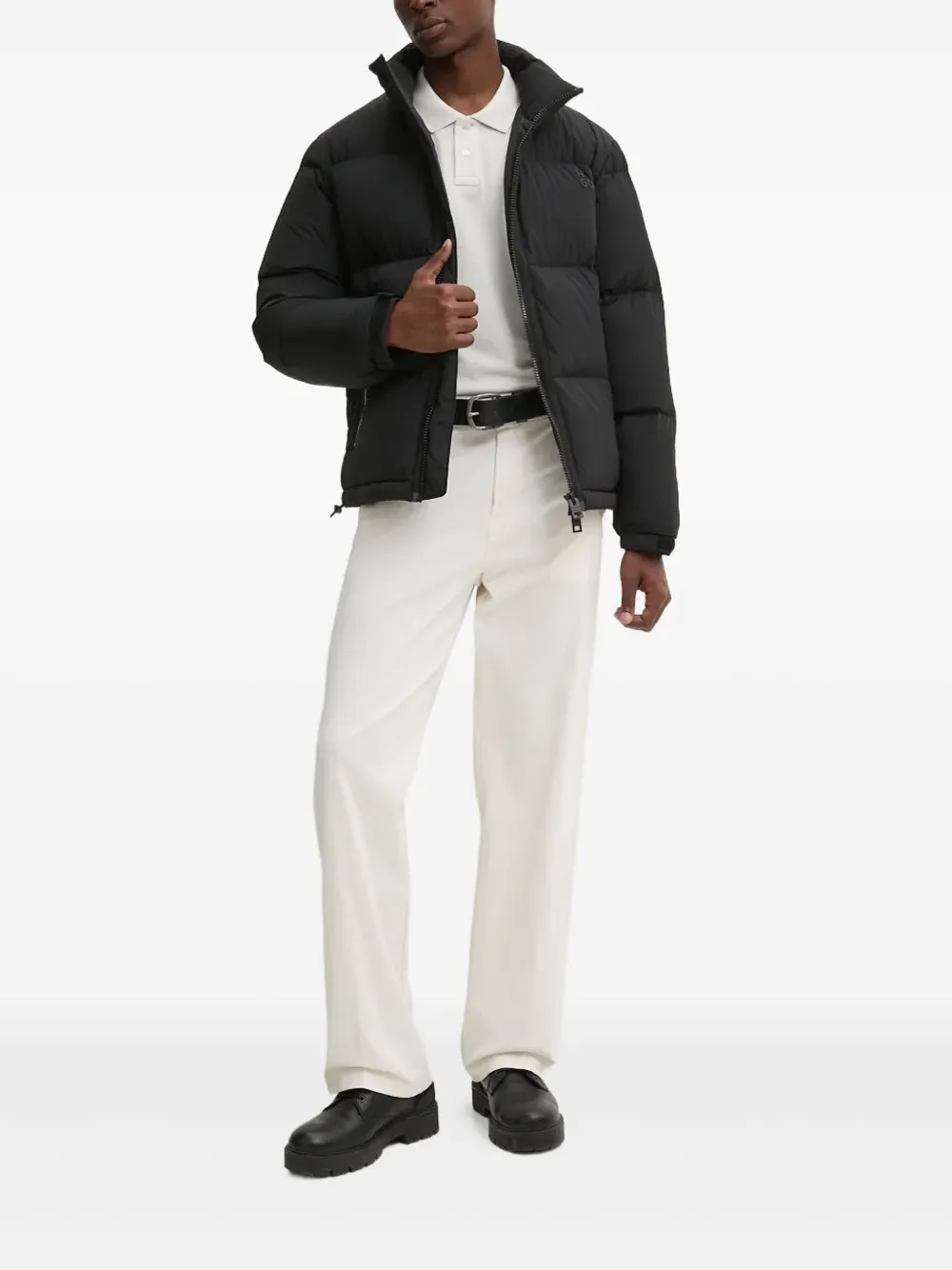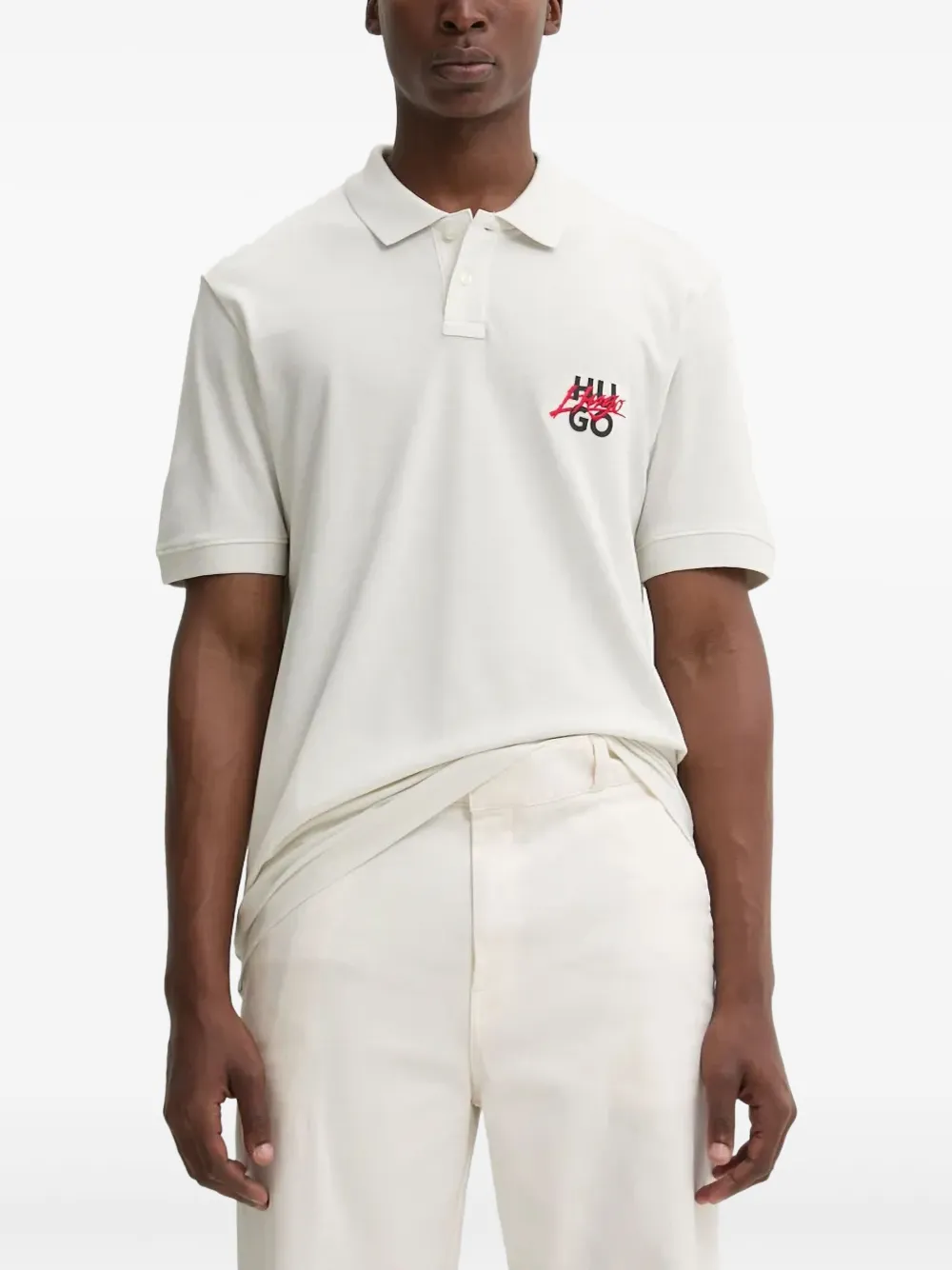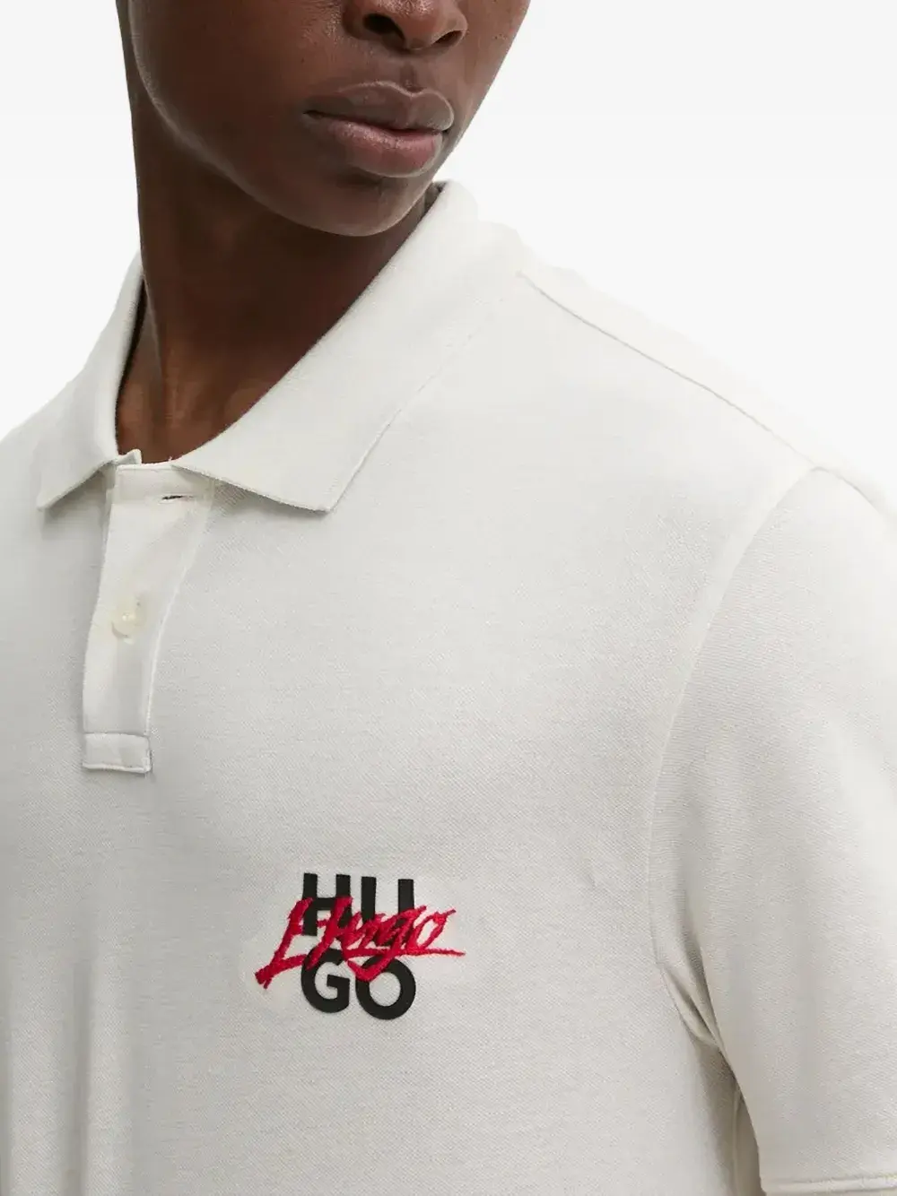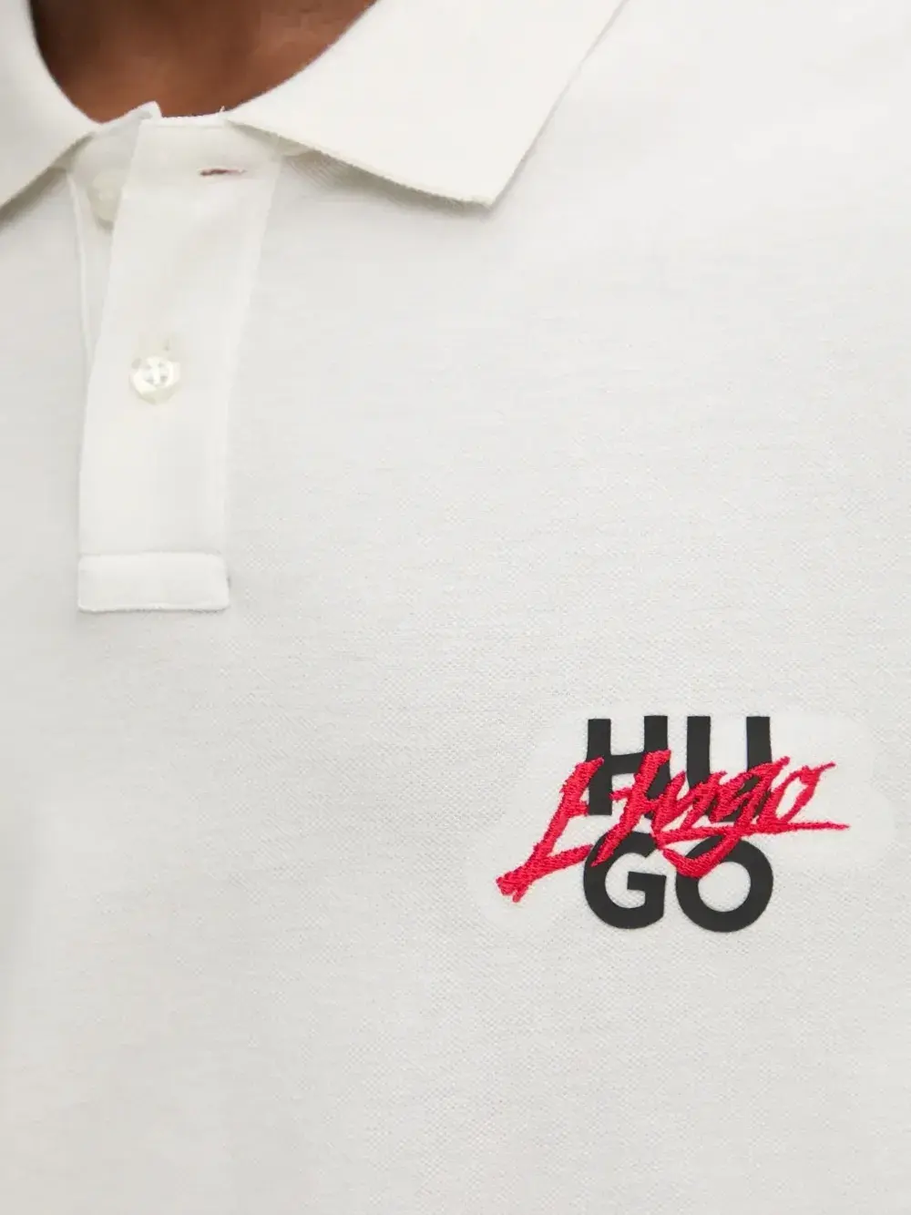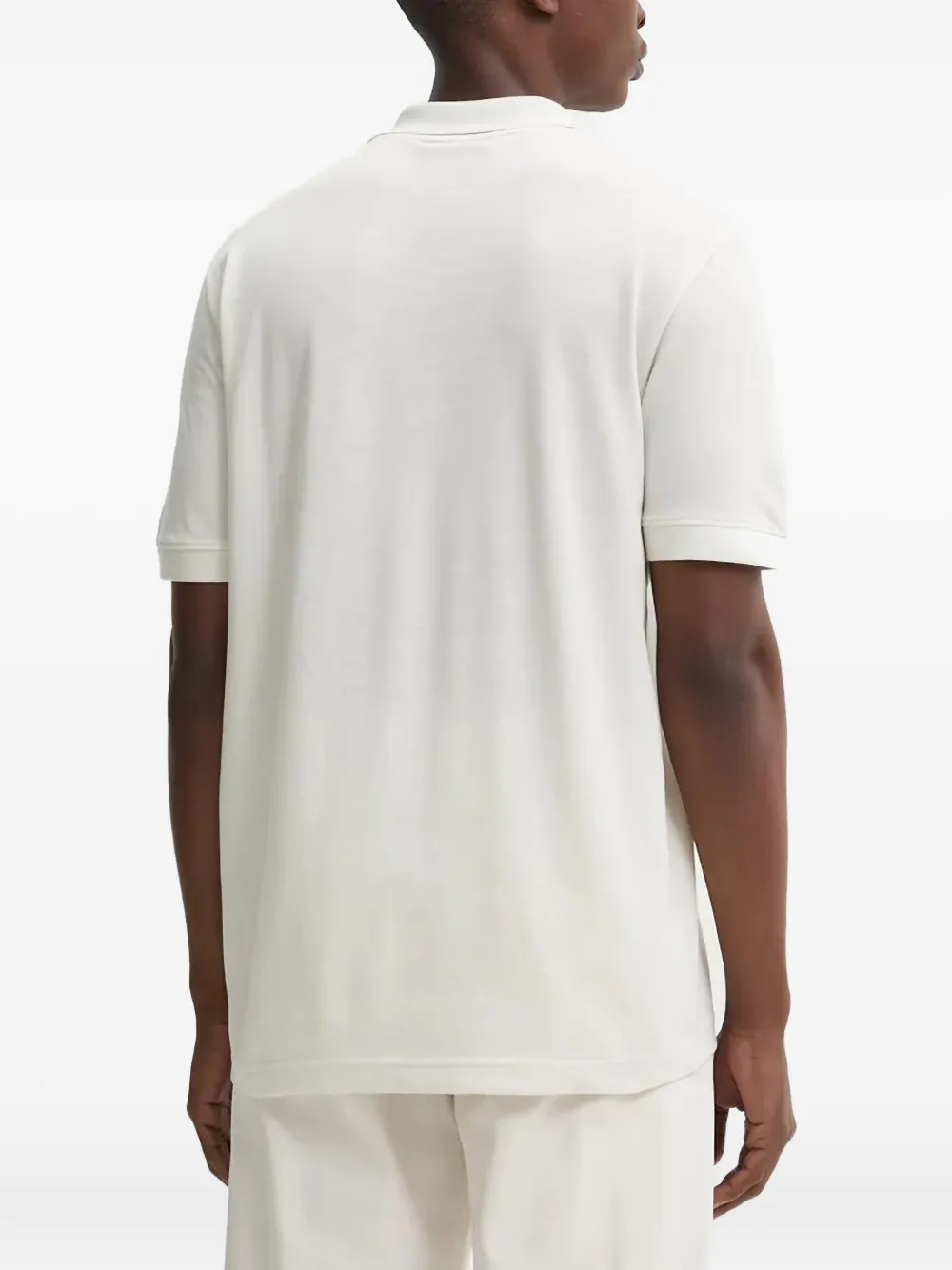 белое поло с логотипом, застёгивающееся на пуговицы, с короткими рукавами и воротником поло