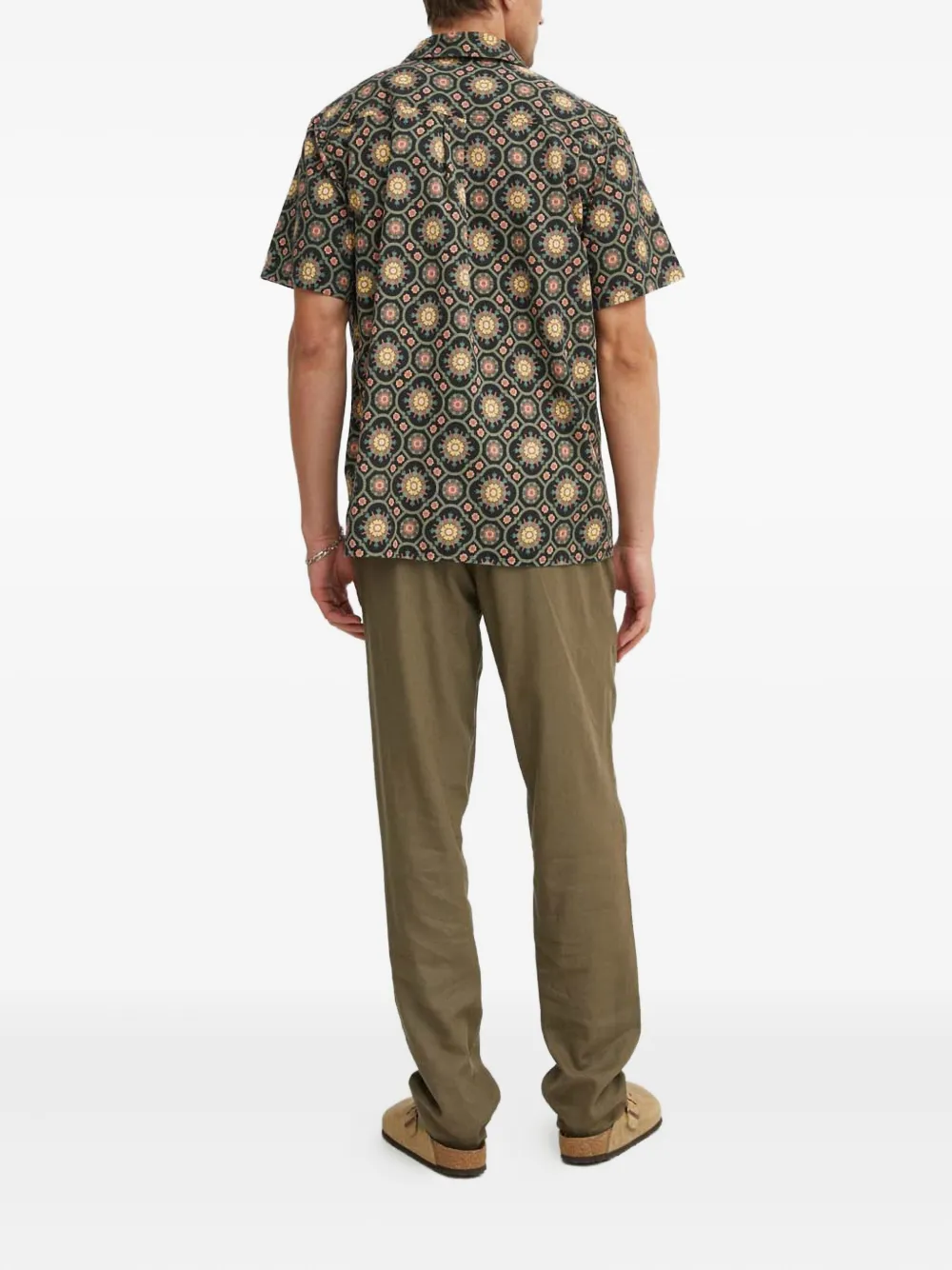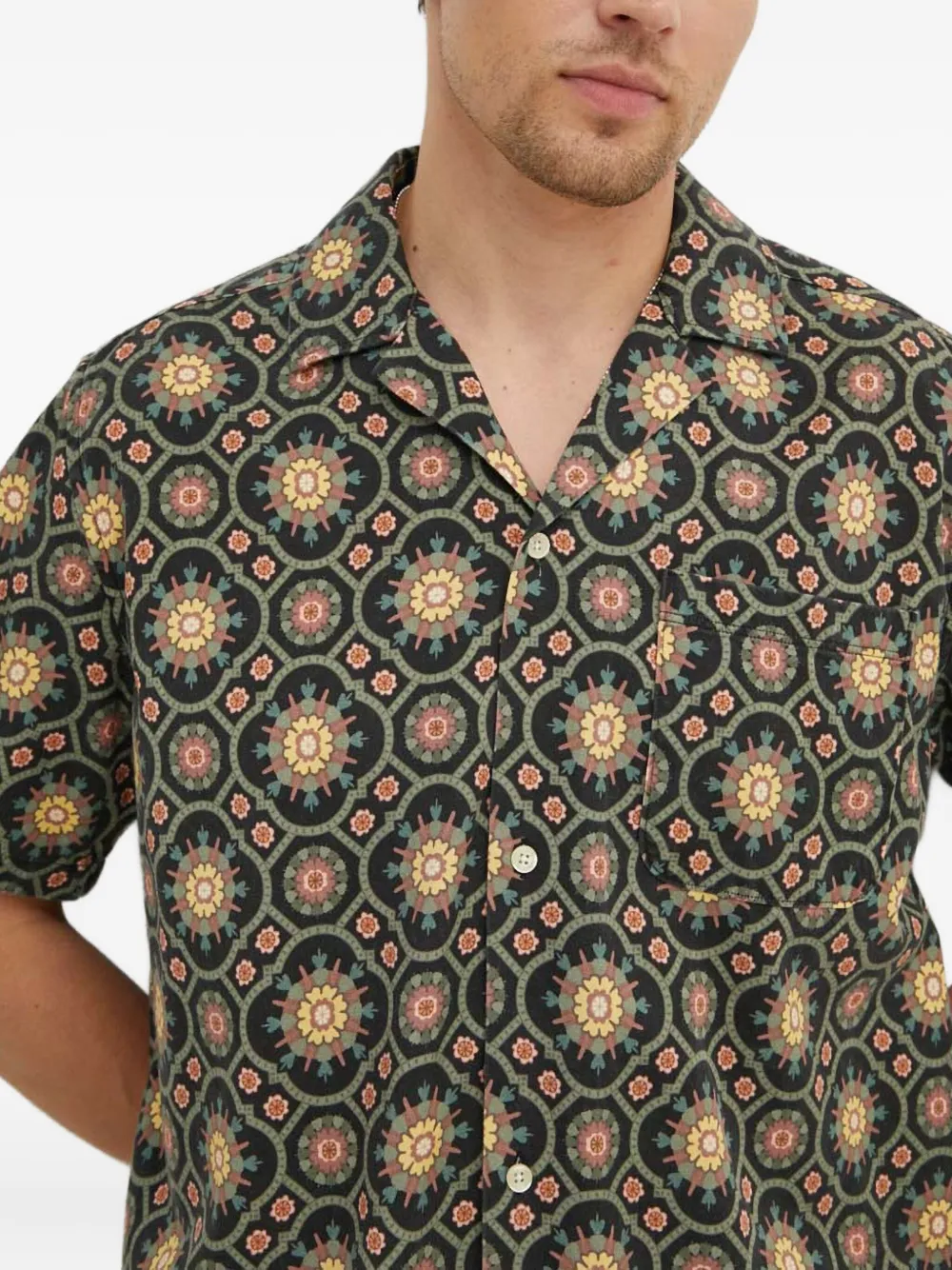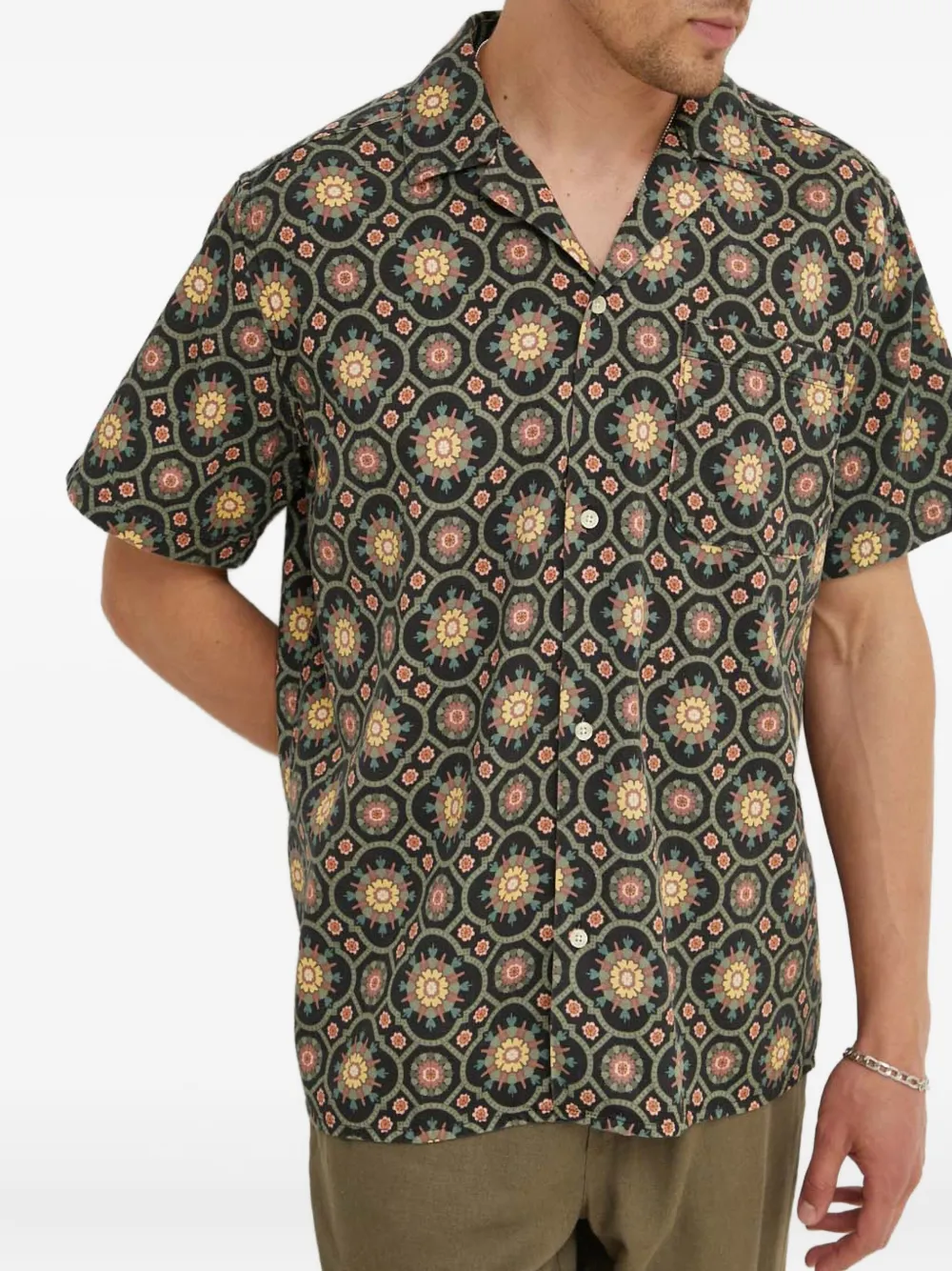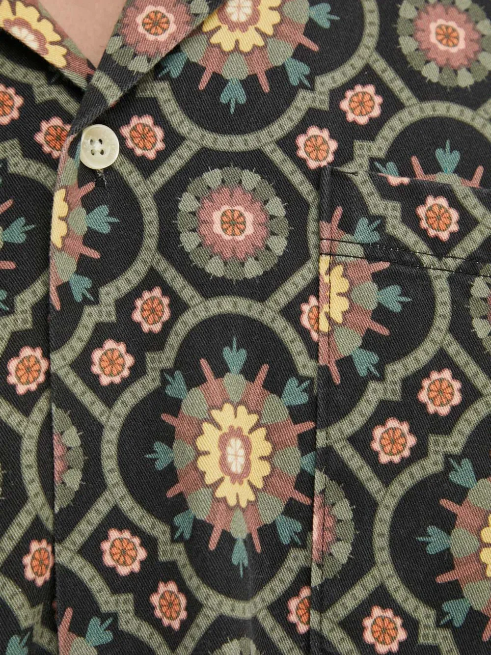 черная рубашка с цветочным принтом, нагрудным карманом, короткими рукавами, застежкой на пуговицы и лагерным воротником