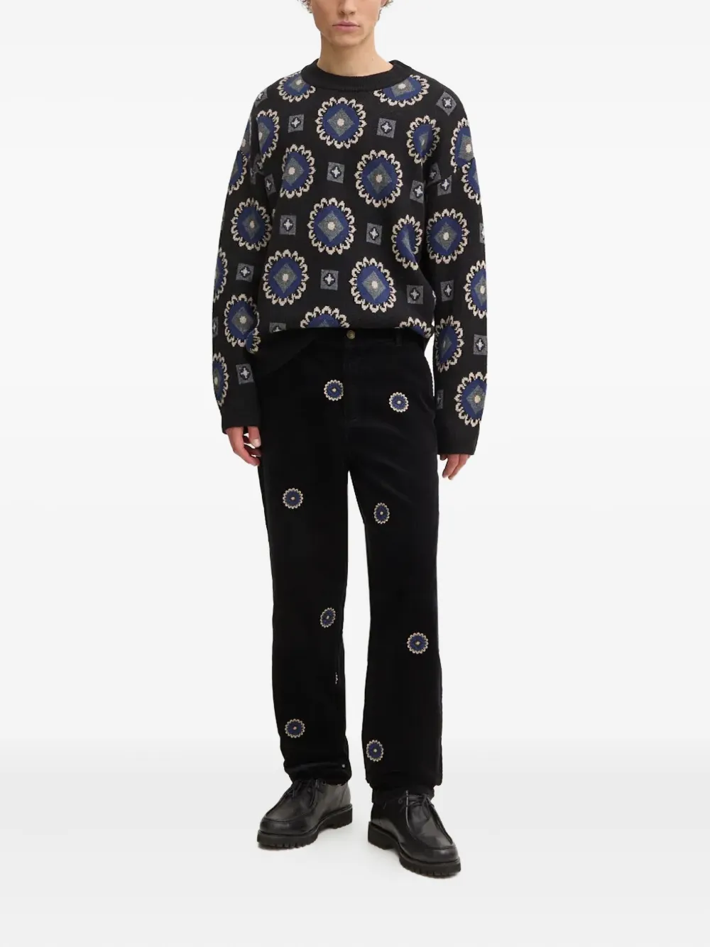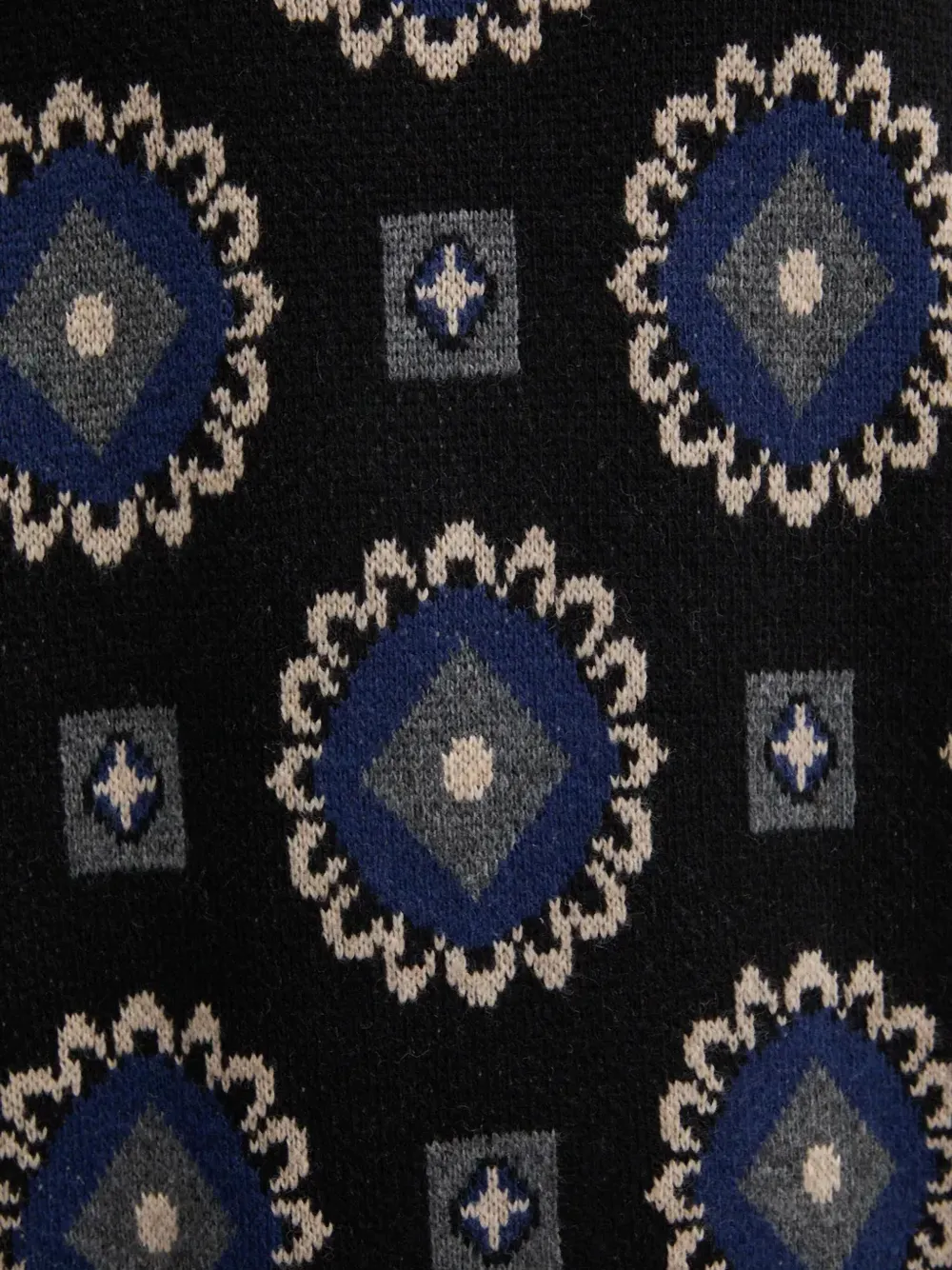 черный свитер с геометрическим узором, круглый вырез, длинные рукава, ребристый низ, ребристые манжеты
