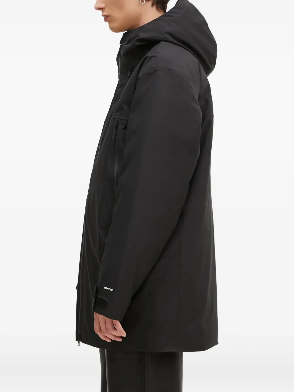чёрная куртка с логотипом, на молнии, с капюшоном, длинными рукавами, боковыми карманами на молнии, водонепроницаемая