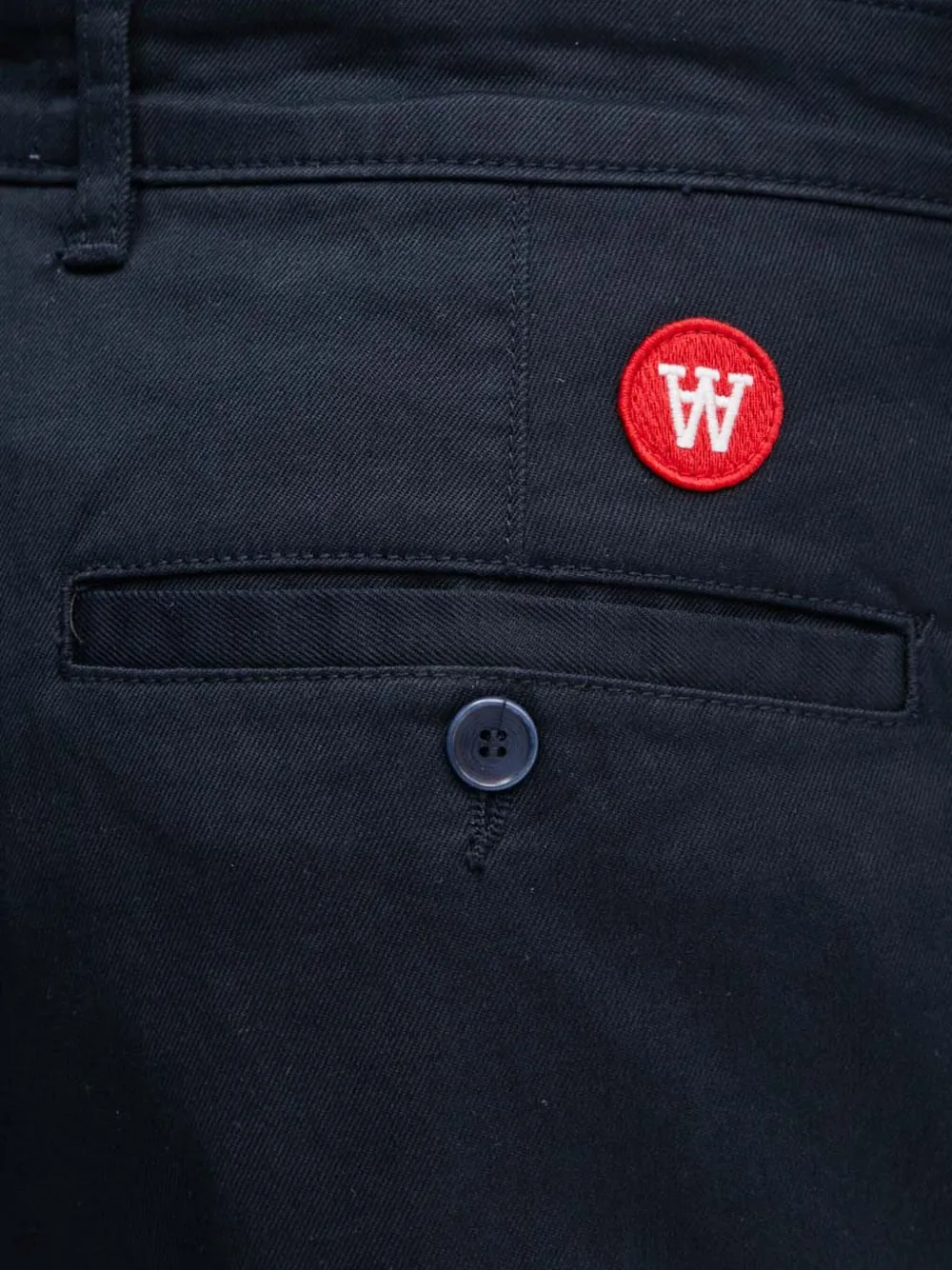 тёмно-синий, задний прорезной карман с кнопкой, молнией и застёжкой на пуговицу, шлёвки для ремня, нашивка с логотипом
