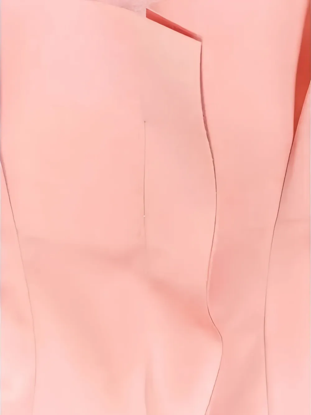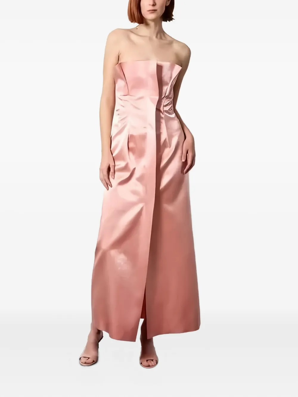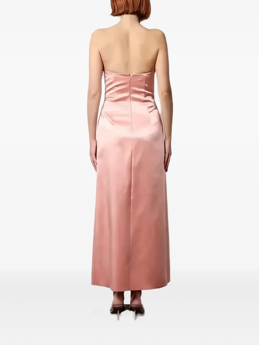 светло-розовое атласное платье миди без бретелек с разрезом спереди