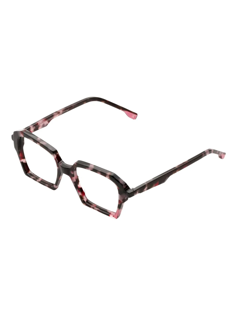 коричневая оправа геометрической формы, носовые упоры, прозрачные линзы.