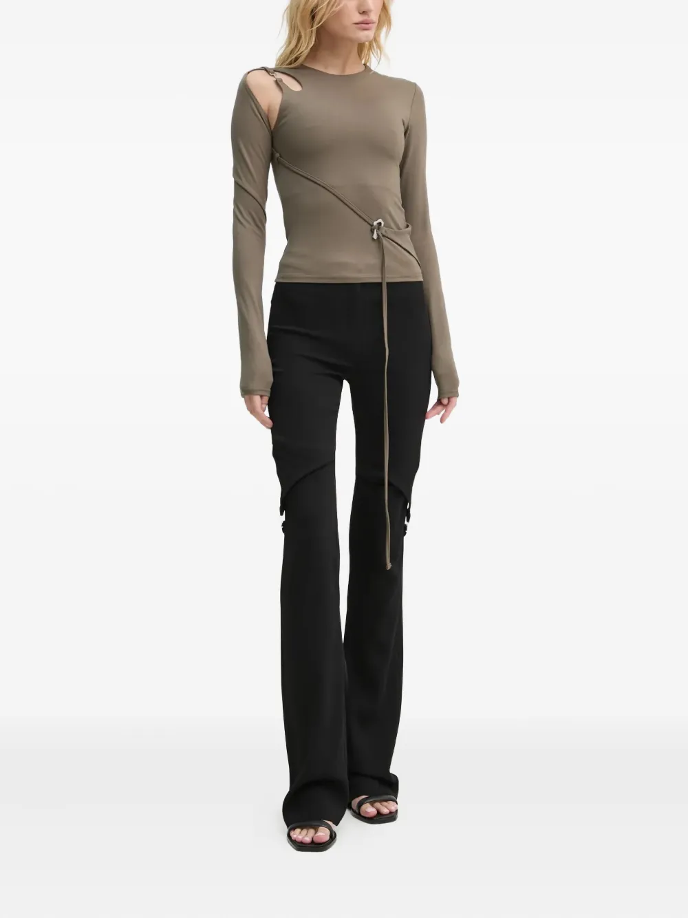 зеленый топ с вырезами, деталями с ремешками, длинными рукавами и круглым вырезом