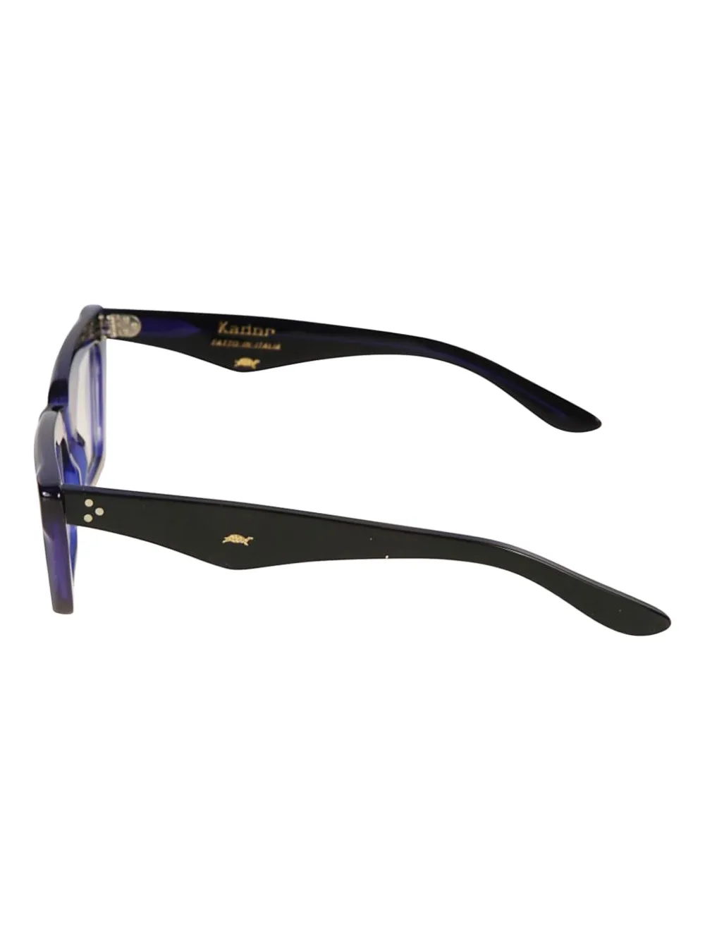 синие очки с квадратной оправой, золотистыми деталями и носоупорами, все очки на FARFETCH продаются без диоптрий, в комплекте идет защитный футляр