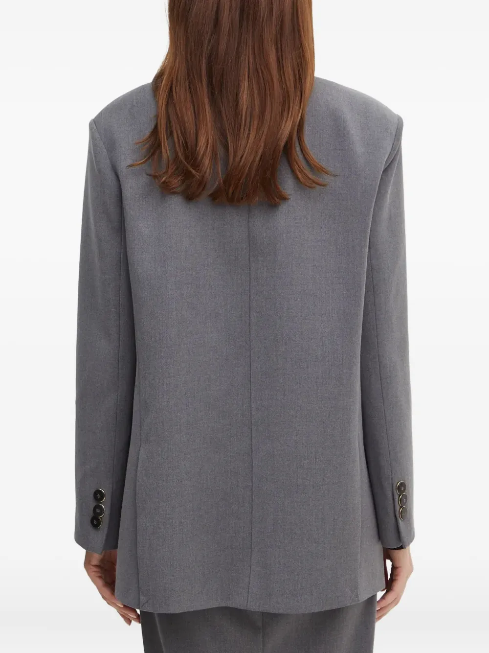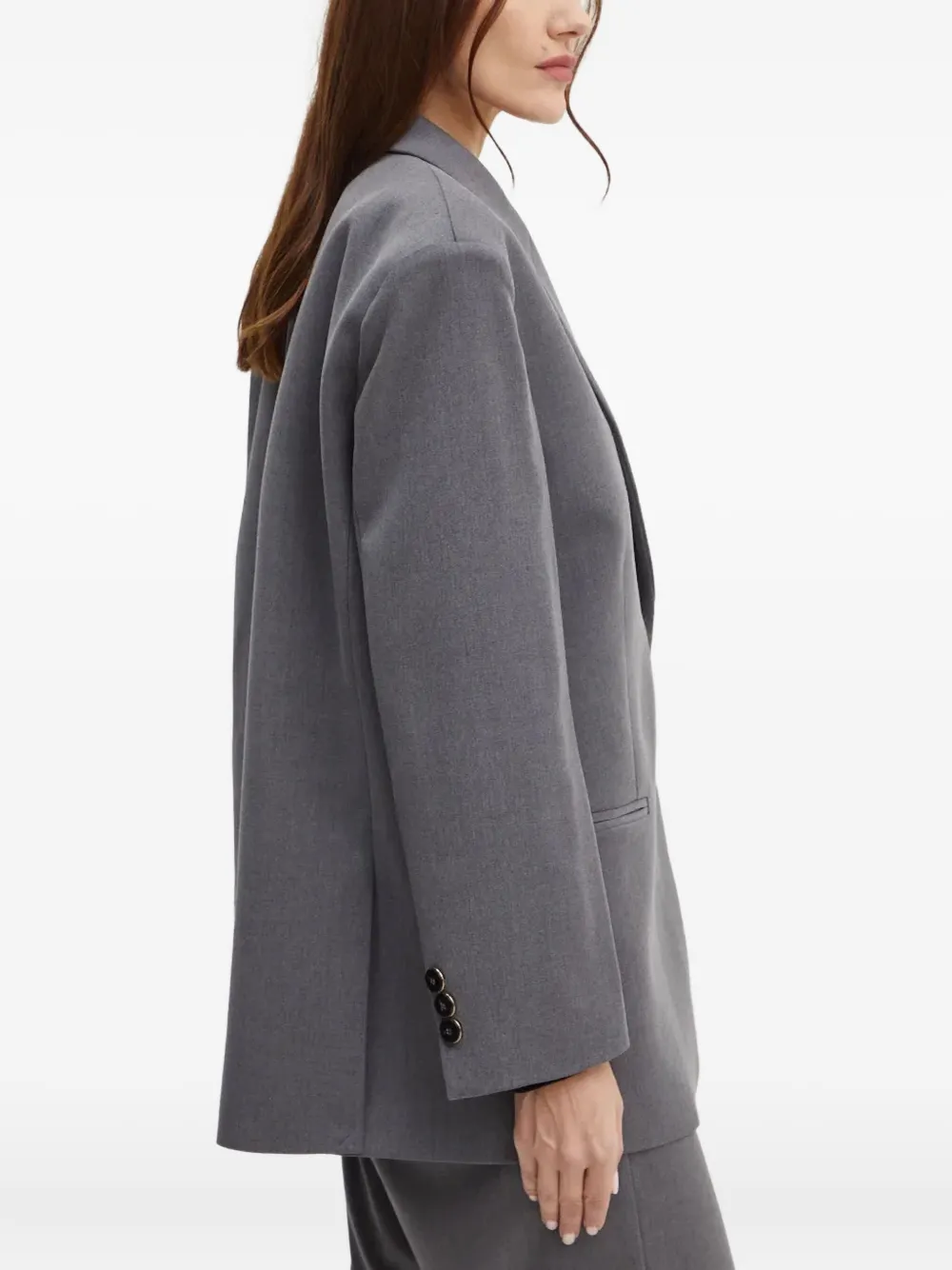 серые заострённые лацканы, застёжка на пуговицы спереди, прорезные карманы спереди, манжеты с тремя пуговицами