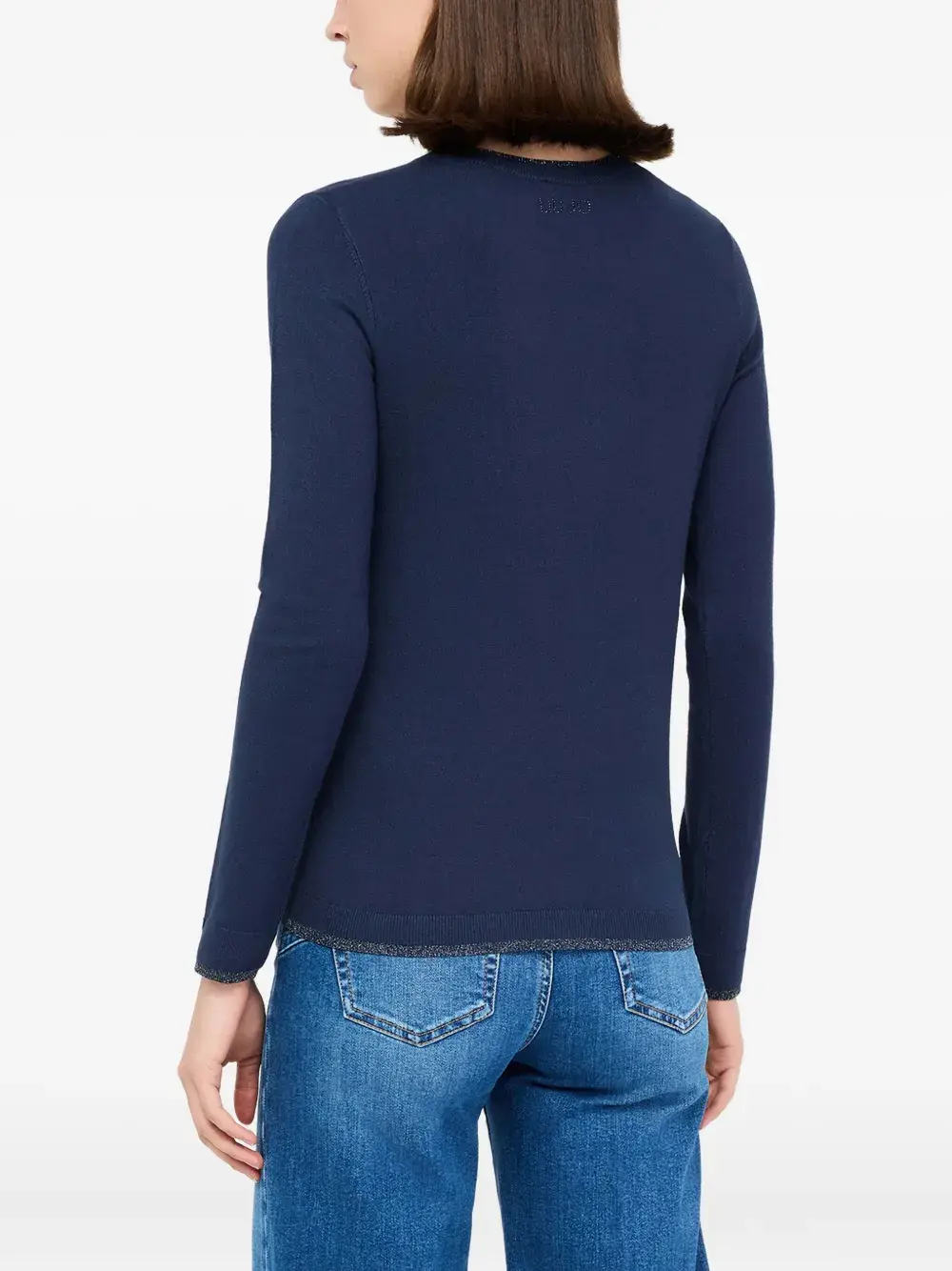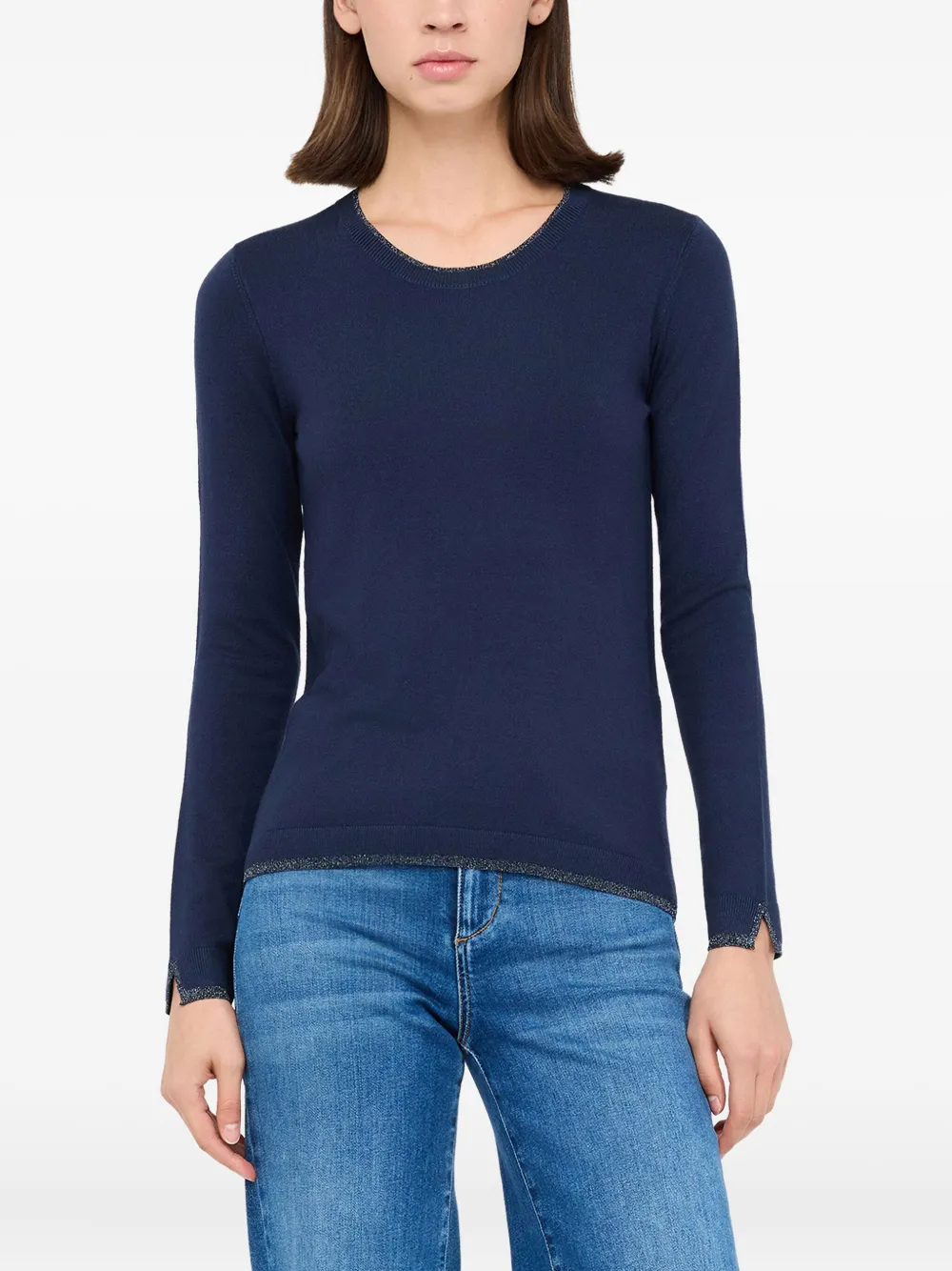 синий джемпер с круглым вырезом, длинными рукавами, разрезами на манжетах и контрастной отделкой