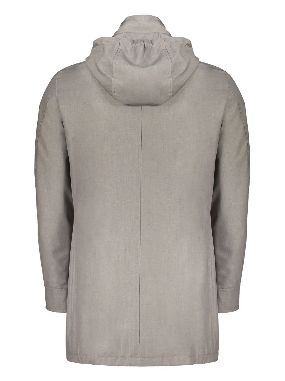 серый цвет, капюшон, застежка-молния на воротнике, застежка на пуговицы, прорезные карманы, манжеты на пуговицах