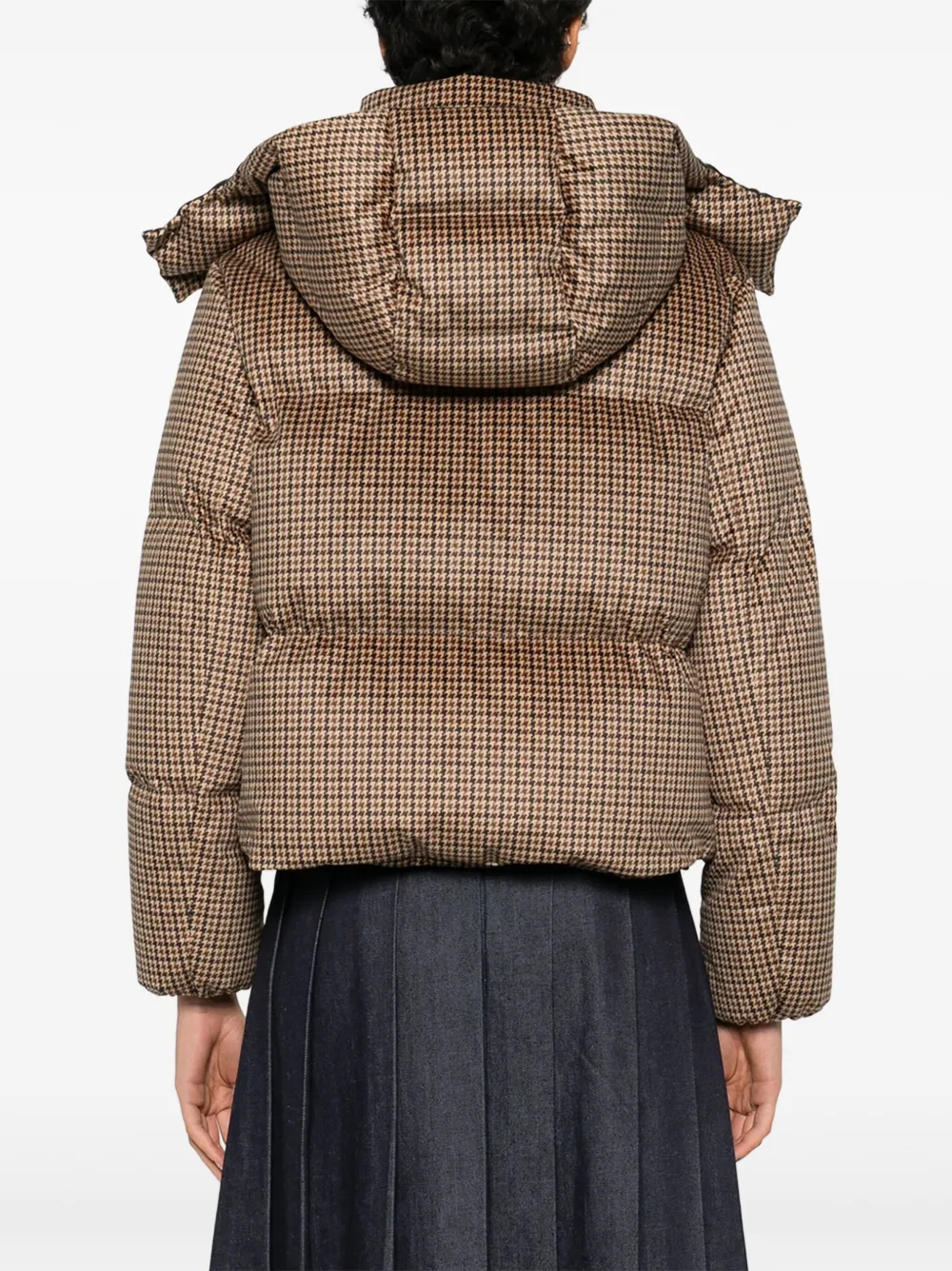 коричневый стеганый пуховик с принтом «гусиная лапка», капюшоном, кнопками и передними карманами