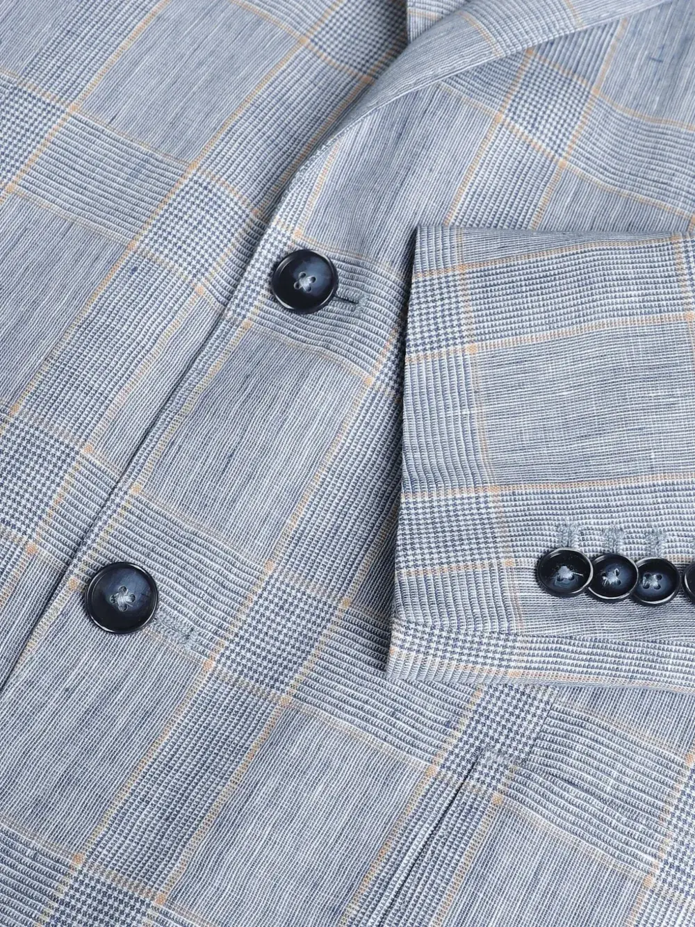 синий пиджак в клетку "Принц Уэльский" с застежкой на пуговицы, лацканами с вырезом, клапанами на карманах и манжетами на пуговицах
