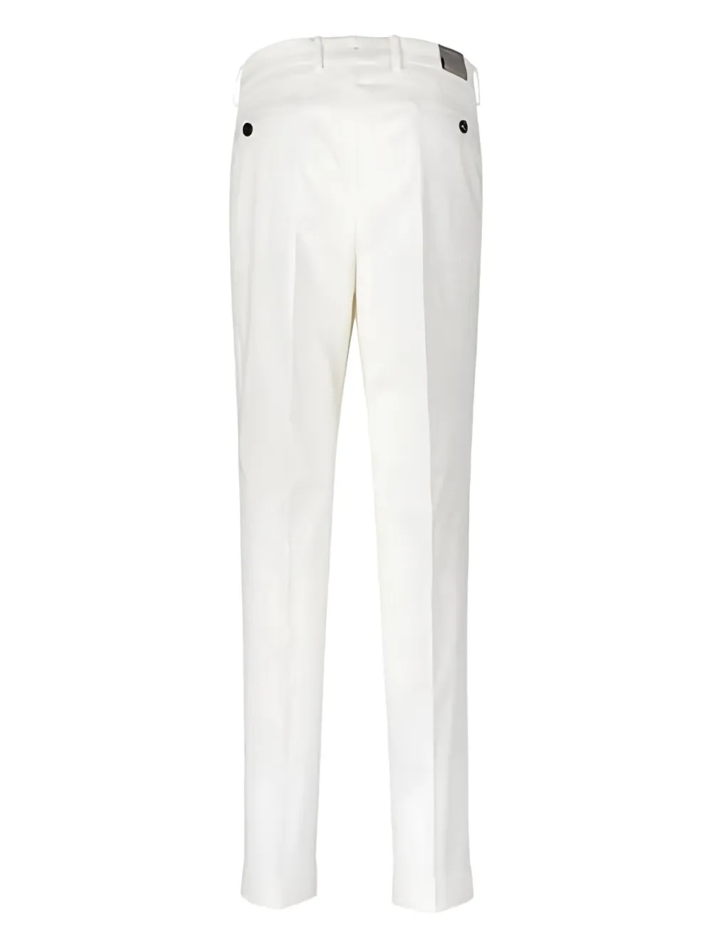 белые брюки с застёжкой на пуговицу, шлёвками для пояса, защипами спереди и манжетами на брючинах