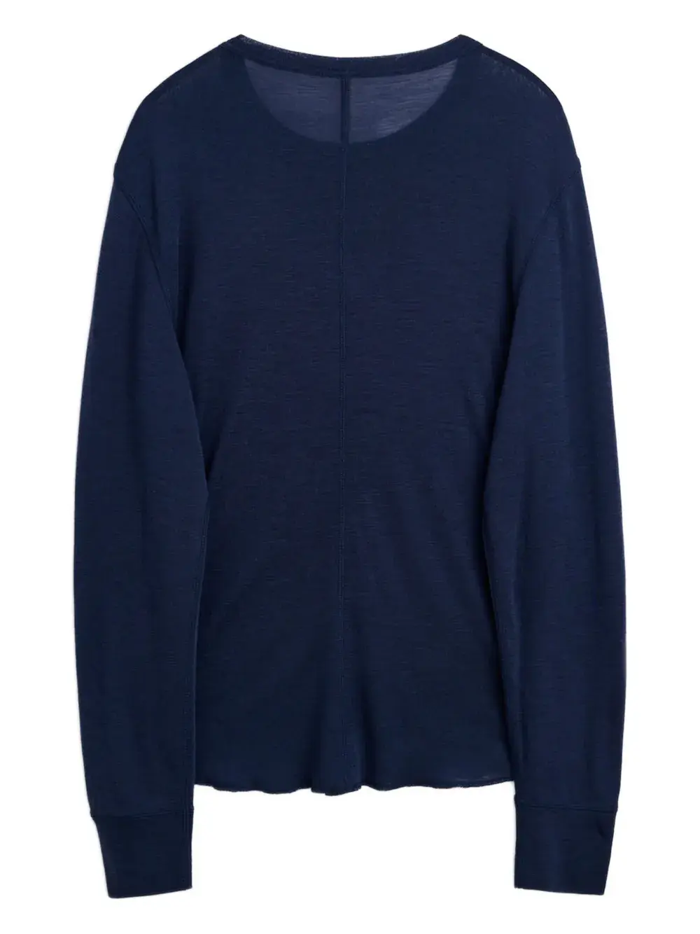 темно-синий, длинные рукава, круглый вырез, прямой низ, фактурные (в рубчик) отделочные элементы