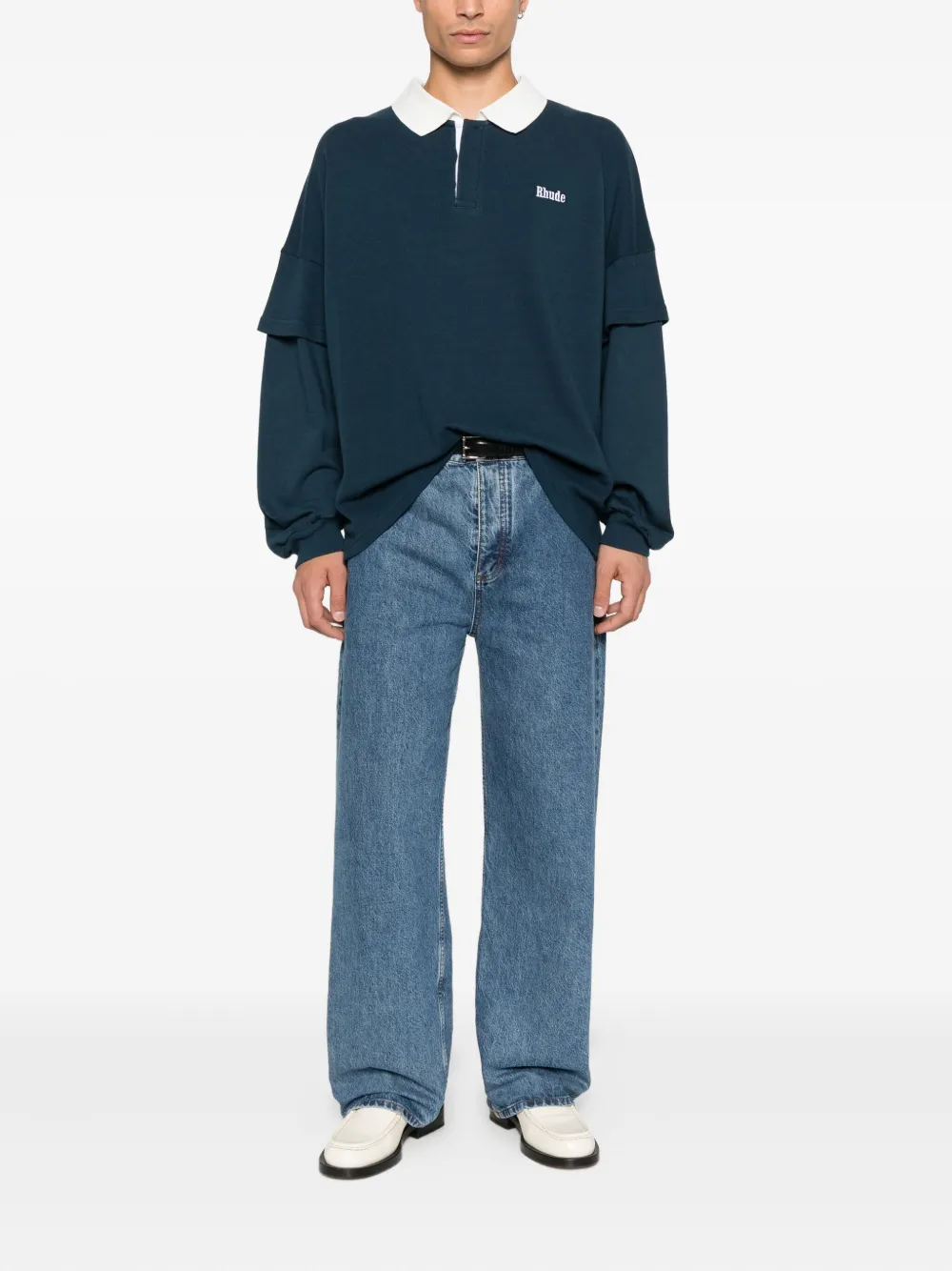 тёмно-синяя рубашка-поло с воротником, длинными рукавами, застёжкой на пуговицы спереди, логотипом и многослойными деталями