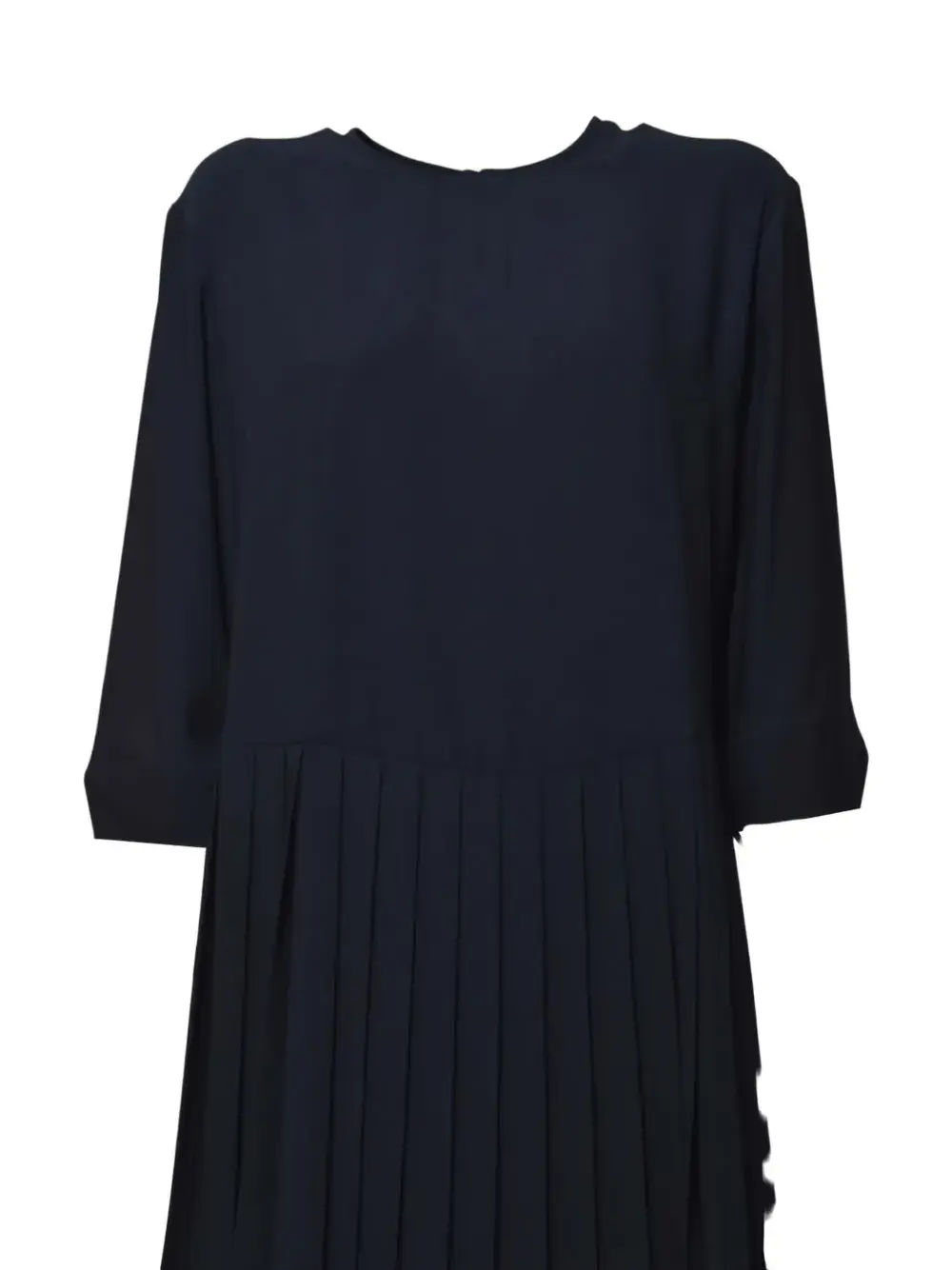 синяя плиссированная юбка, рукава три четверти, круглый вырез, застежка-капля на спине