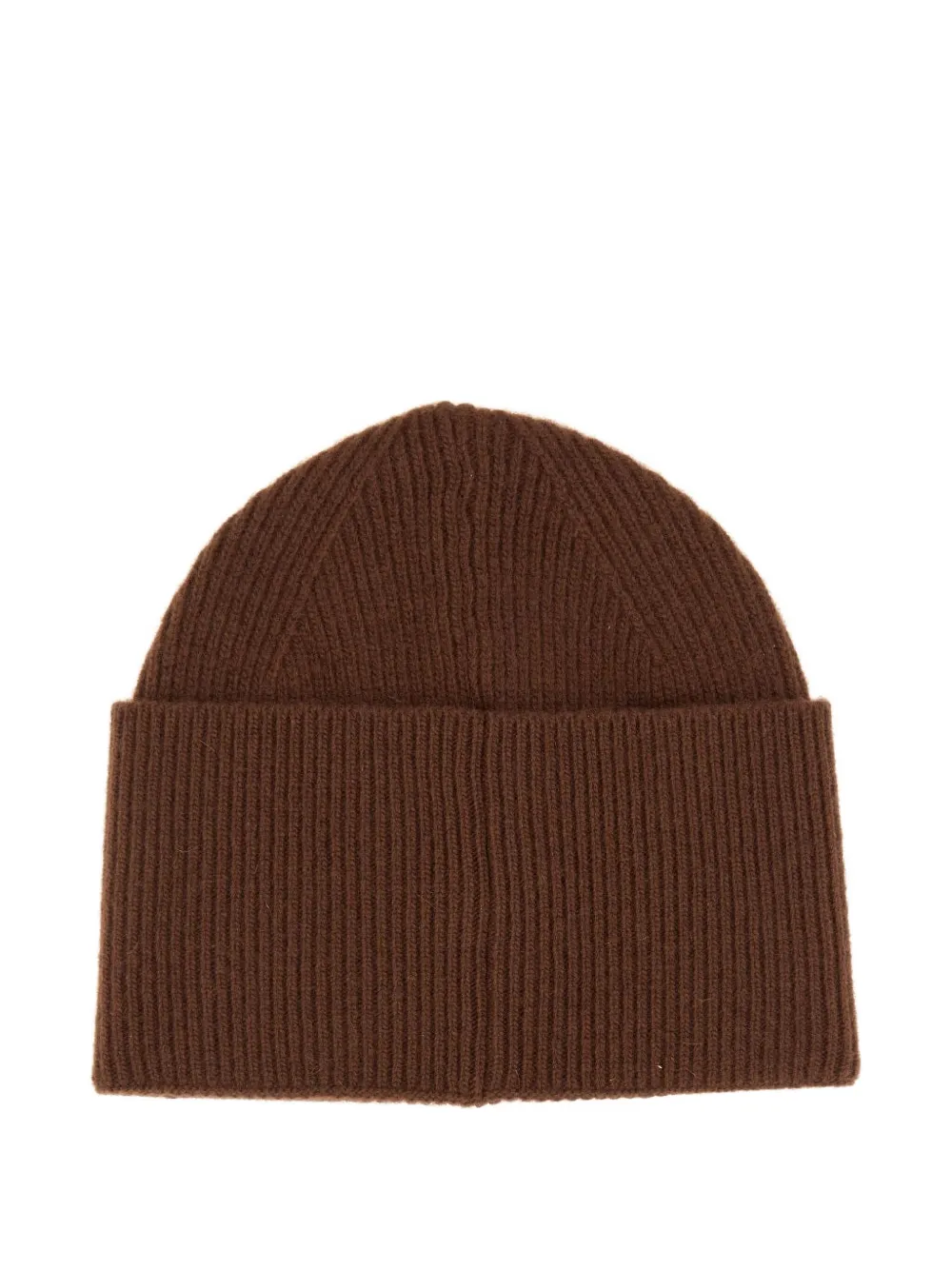 коричневая вязаная шапка в рубчик с отворотом и нашивкой-логотипом