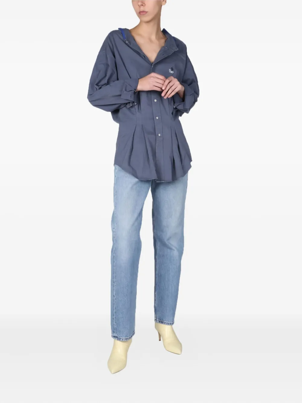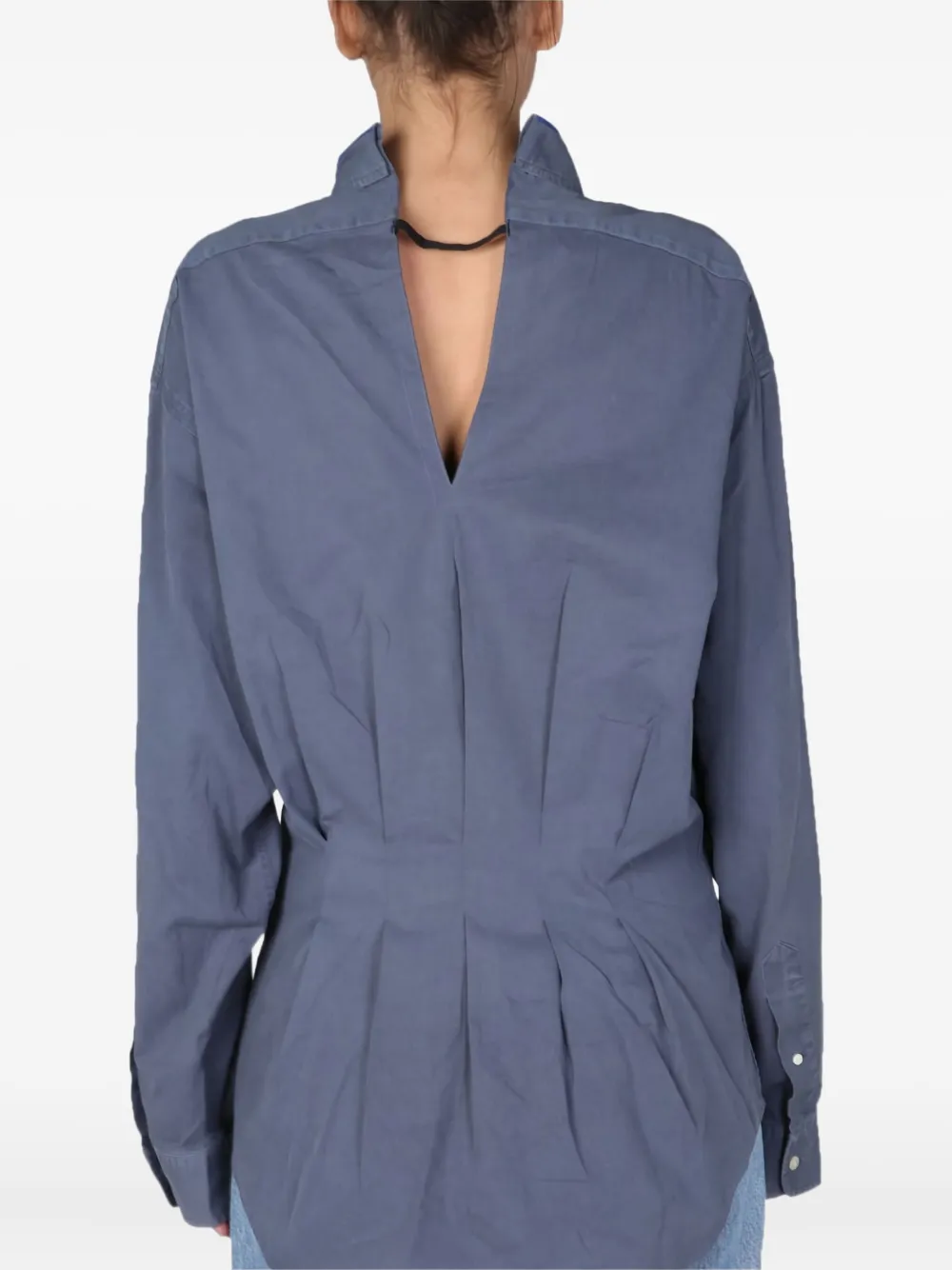 джинсовая рубашка с застежкой на пуговицы, складками, длинными рукавами, манжетами на пуговицах и заостренным воротником