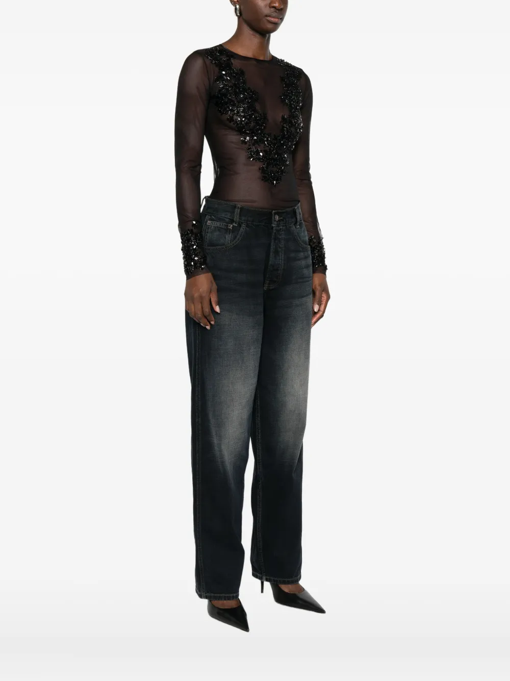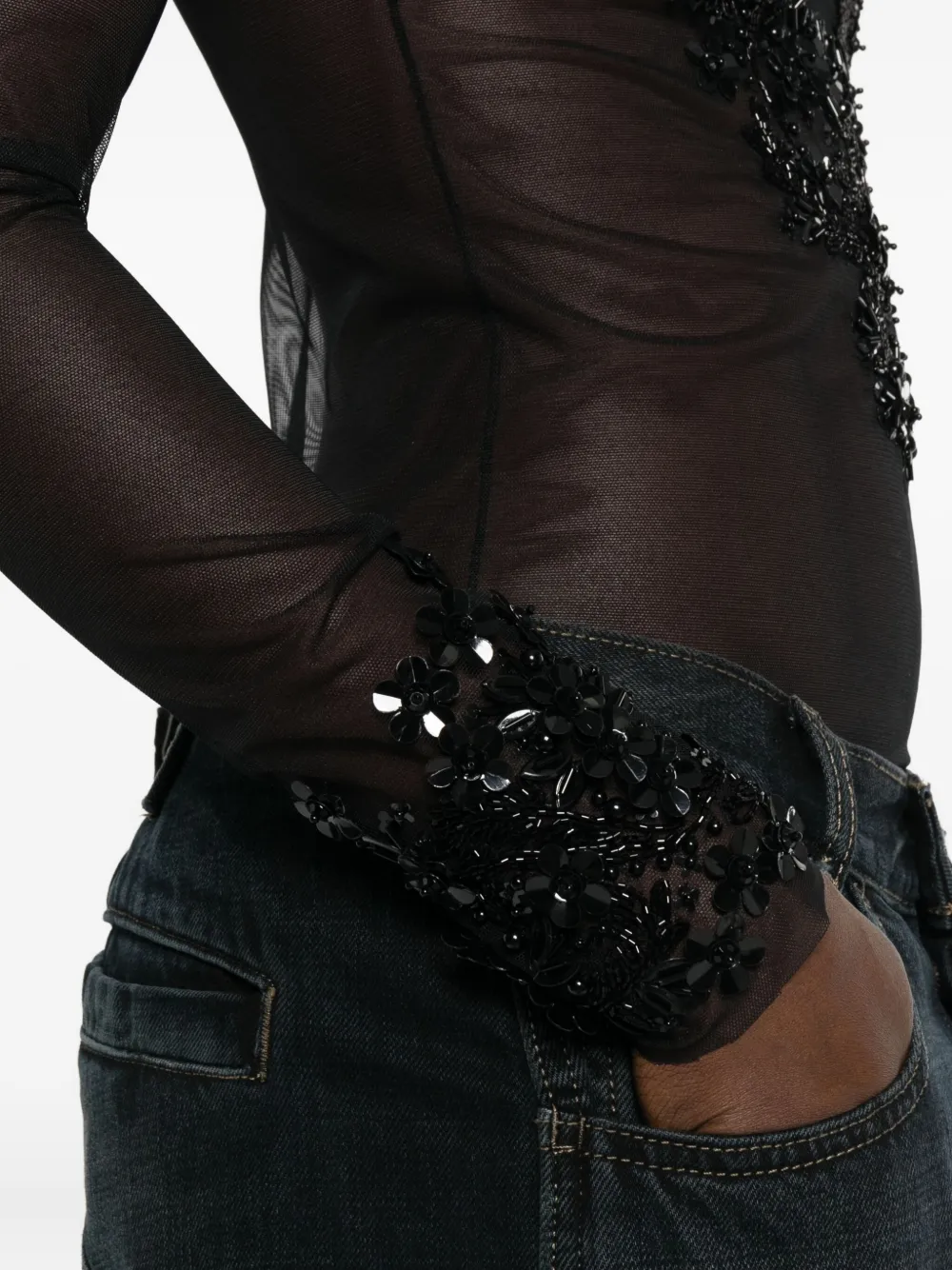 черные прозрачные вставки, украшения из бисера, длинные рукава, застежка на пуговицу сзади