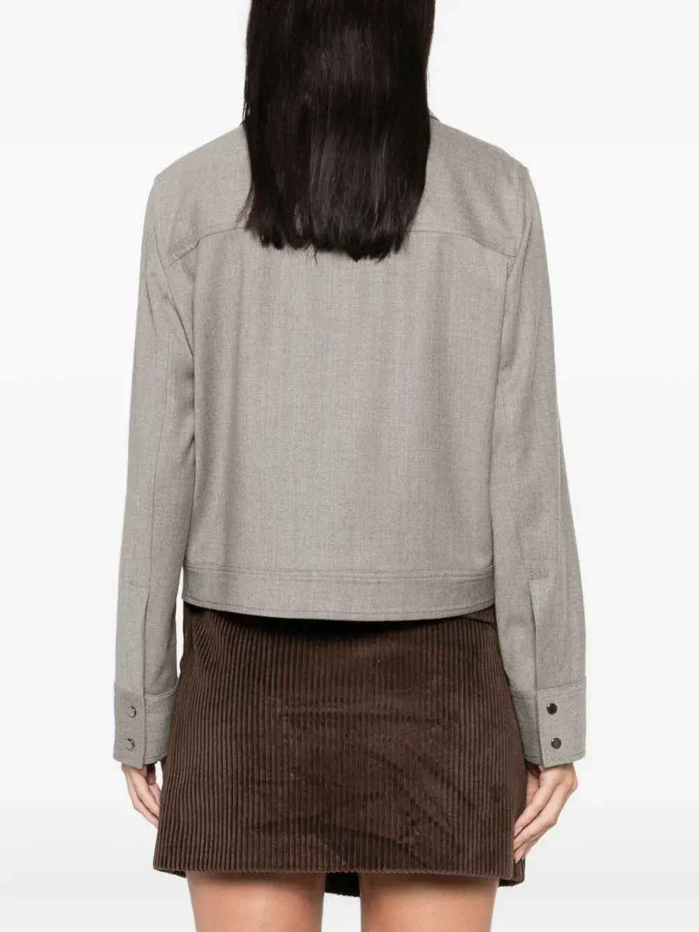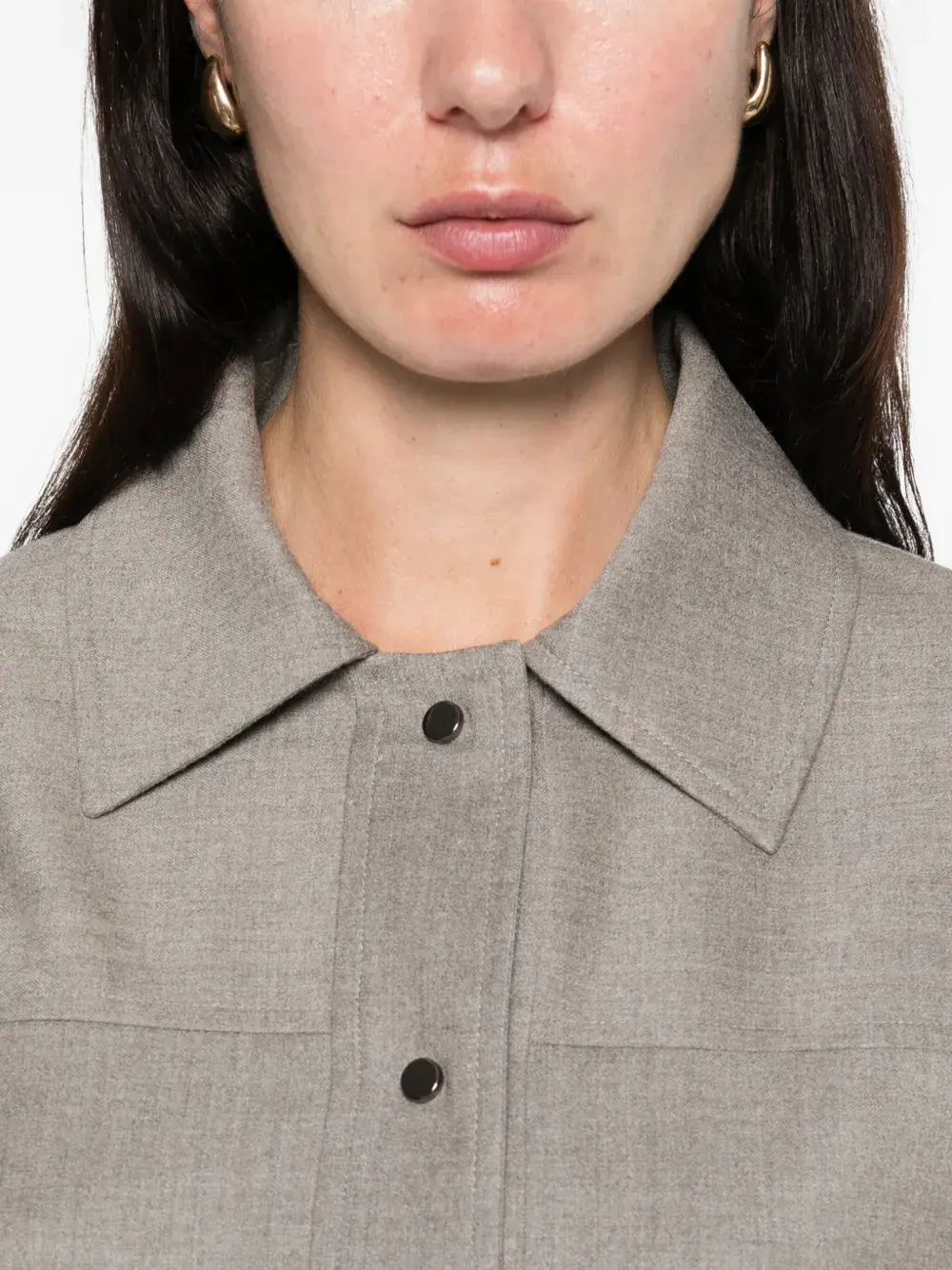 бежевый, застёжка на пуговицы спереди, отложной воротник, два нагрудных кармана с клапанами, длинные рукава, прямой подол