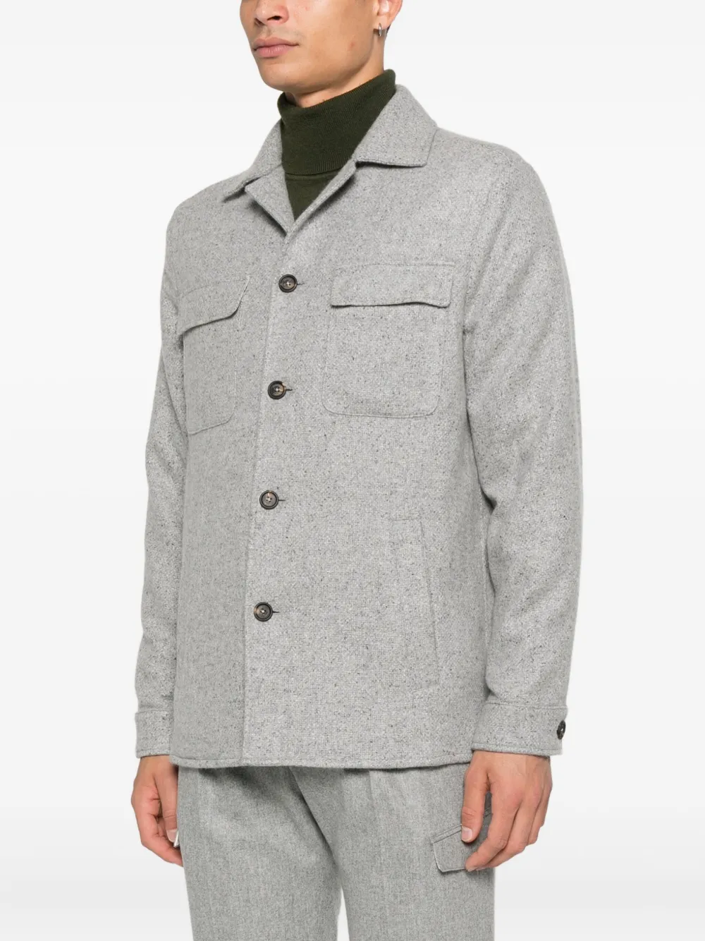 серый цвет, отложной воротник, застежка на пуговицы, два нагрудных кармана, длинные рукава, прямой низ