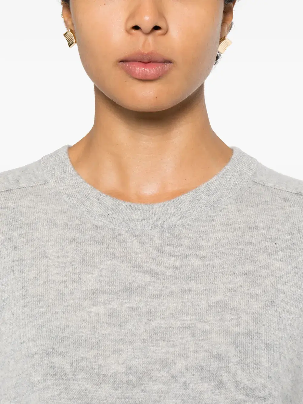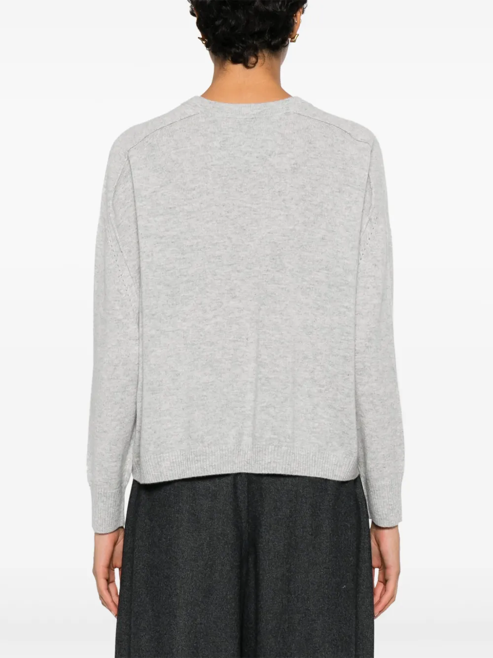 серый свитер с круглым вырезом, длинными рукавами, ребристыми краями и манжетами, однотонная строчка