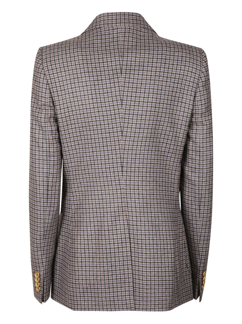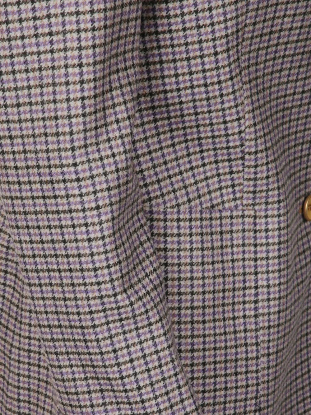 серый и фиолетовый клетчатый узор, лацканы с вырезом, застежка на пуговицы спереди, длинные рукава, накладные карманы спереди