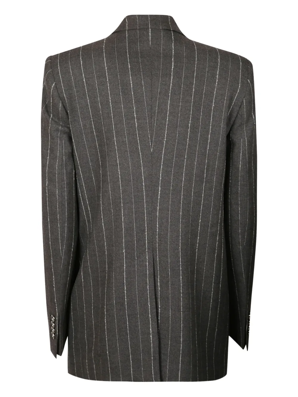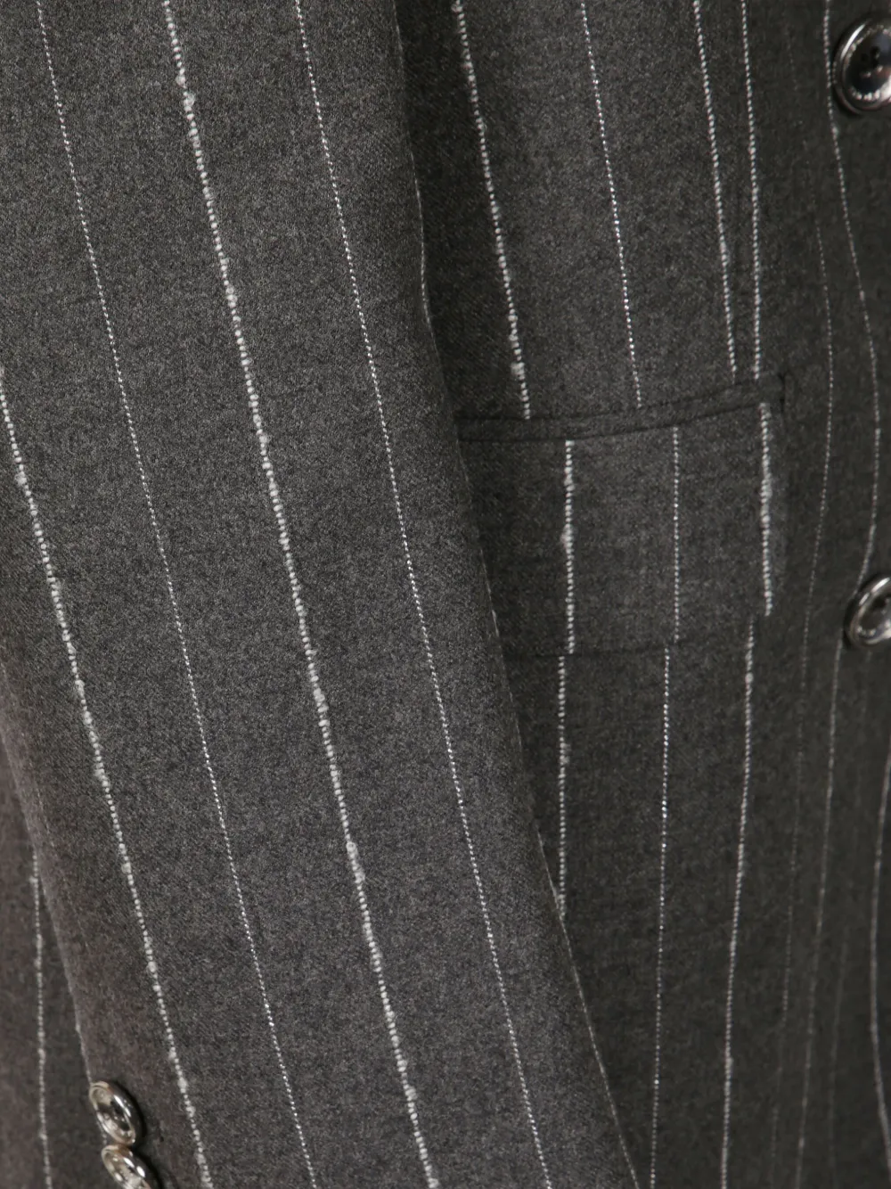 темно-серый с узором в полоску, двубортная застежка на пуговицах, лацканы с вырезом, карманы с клапанами